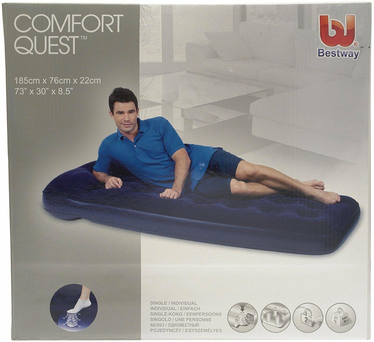 10 цен на Надувной матрас 76х185х28см с подголовником, встр. ножной насос, до 150кг