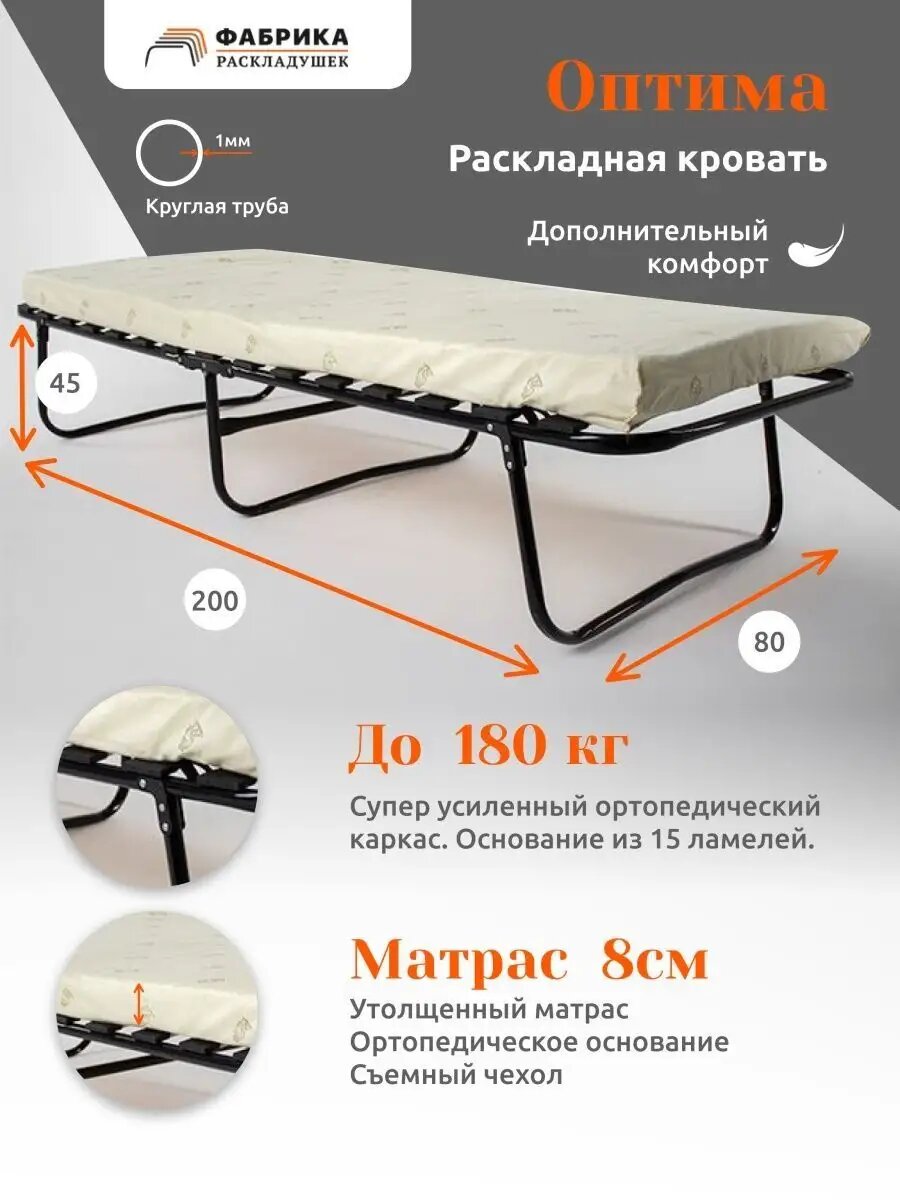Раскладушка Фабрика-Раскладушек "Оптима", сталь, матрас, 200x80x39 см информация:
