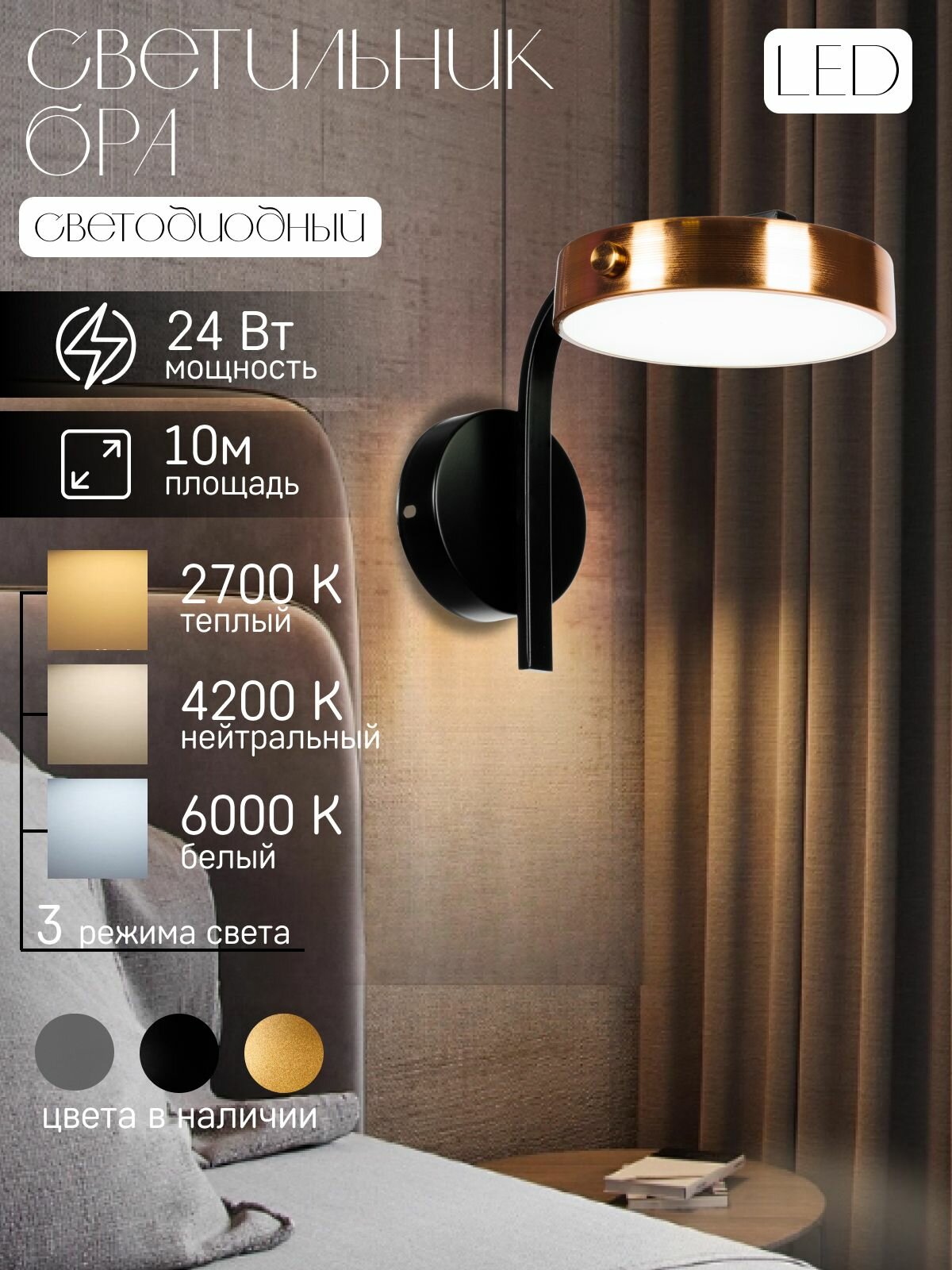 Светильник настенный, бра настенные, 6 Вт, 43 см, трехцветный меняющийся свет