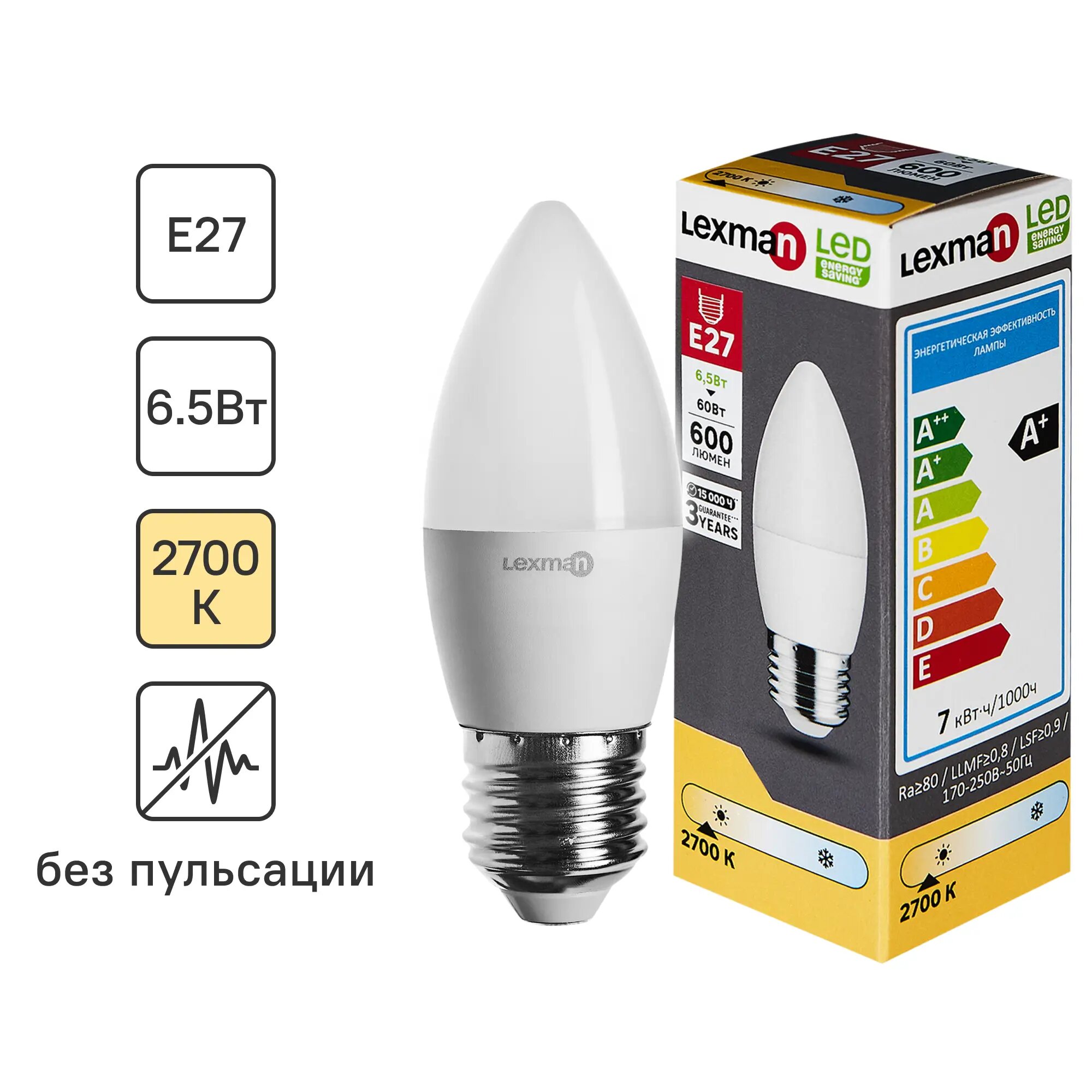 Лампа светодиодная Lexman E27 175-250 В 6.5 Вт свеча 600 лм теплый белый цвет света информация: