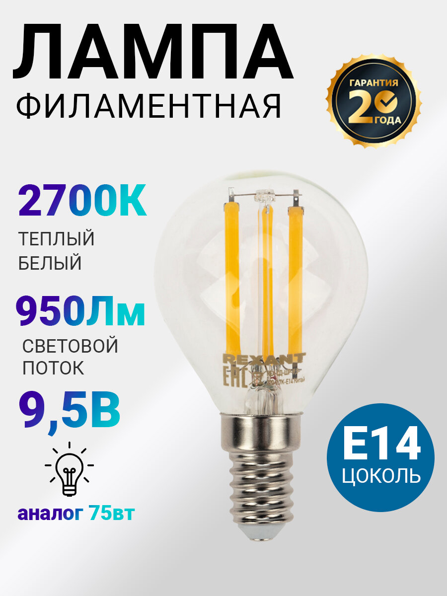 Лампочка филаментная REXANT Шарик GL45 9.5 Вт 950 Лм 2700K E14 прозрачная колба информация: