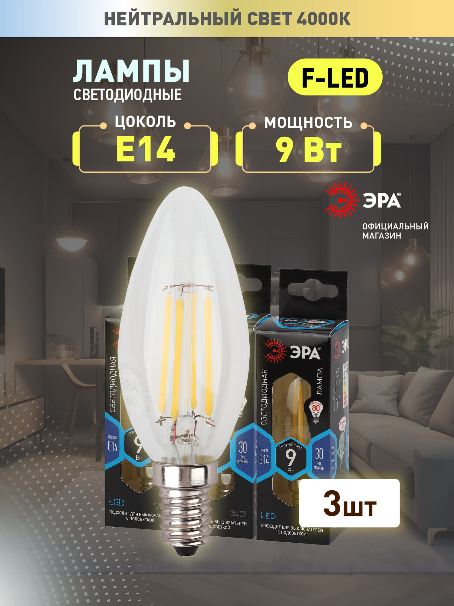 Отзывы на Набор светодиодных лампочек ЭРА F-LED B35-9w-840-E14 4000K свеча 9 Вт 3 штуки