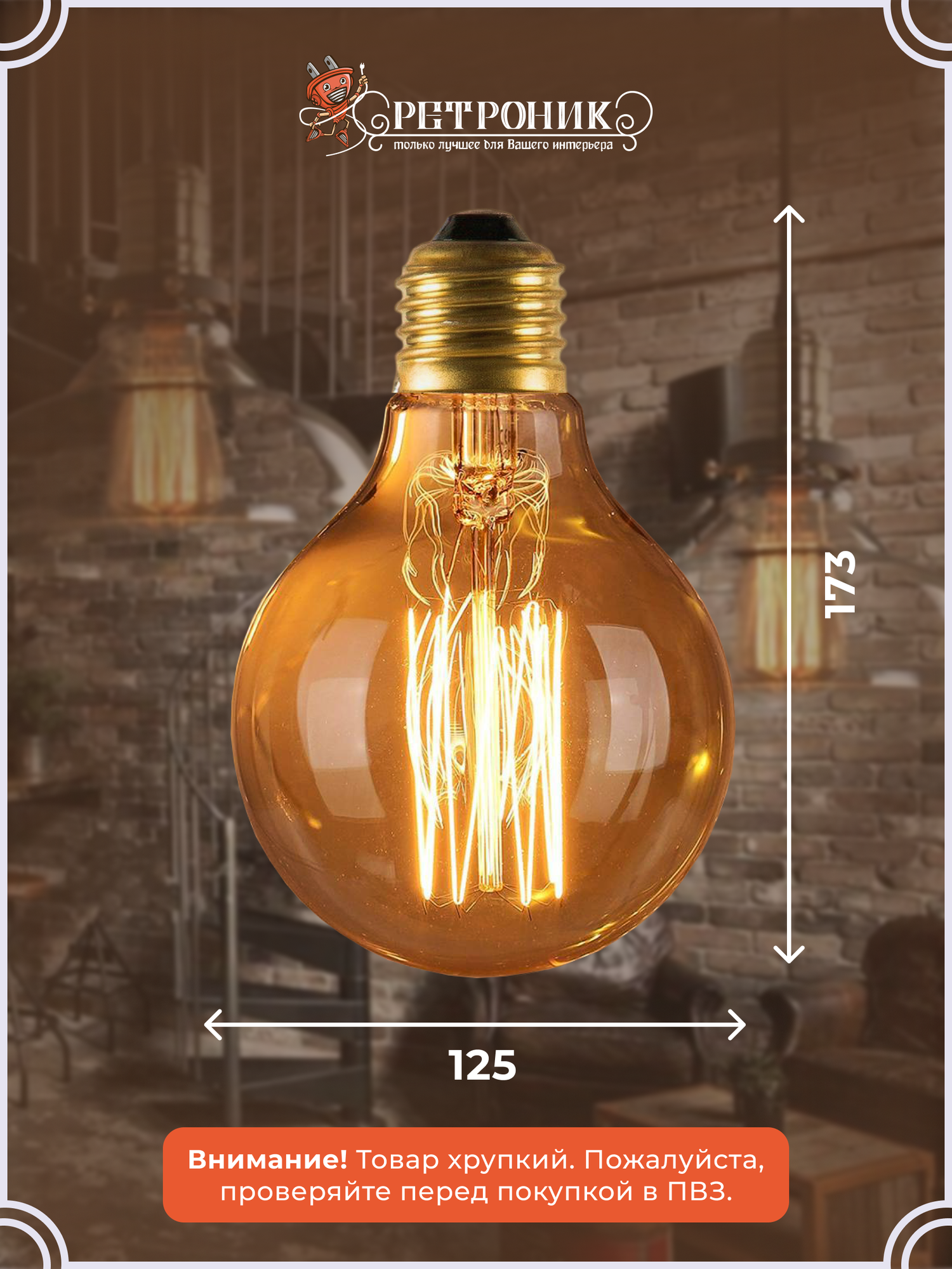 Лампы Эдисона Ретроник G125 круглая янтарное стекло (лампа накаливания), G125-Ret-27 информация: