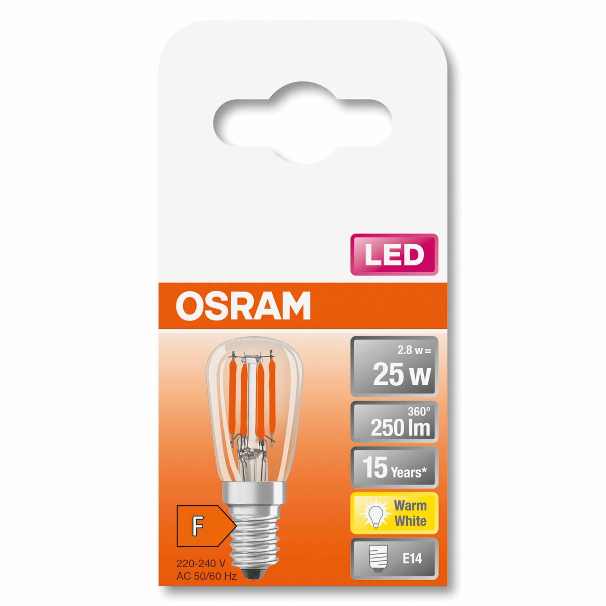 10 цен на 1шт/уп. Лампа для холодильника LED 2.8Вт 220-240V E14 T26 250Лм 2700К Угол 300 град. D-26mm L-63mm Филаментная Стекло Свет Теплый белый OSRAM, уп. 1шт