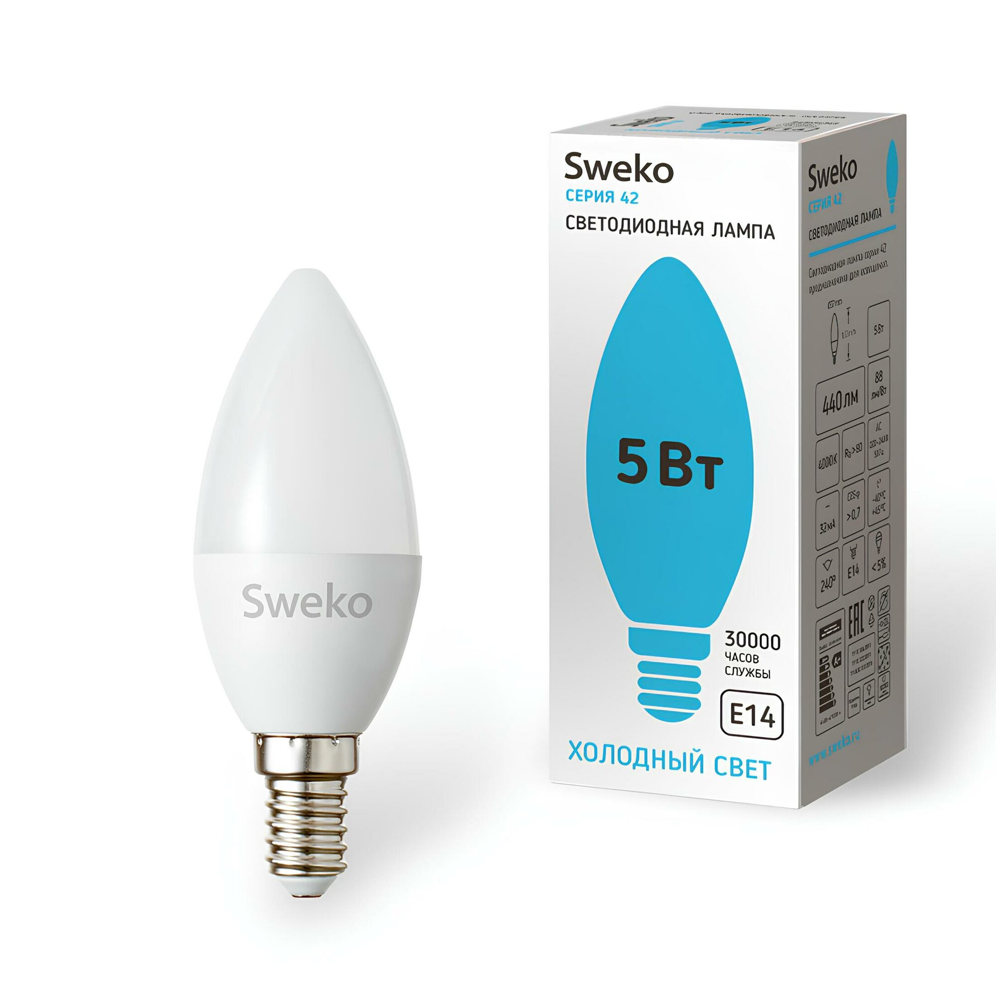Лампа диодная Sweko 5 шт свеча холодная E14 5Вт дм35 4000К/410лм информация: