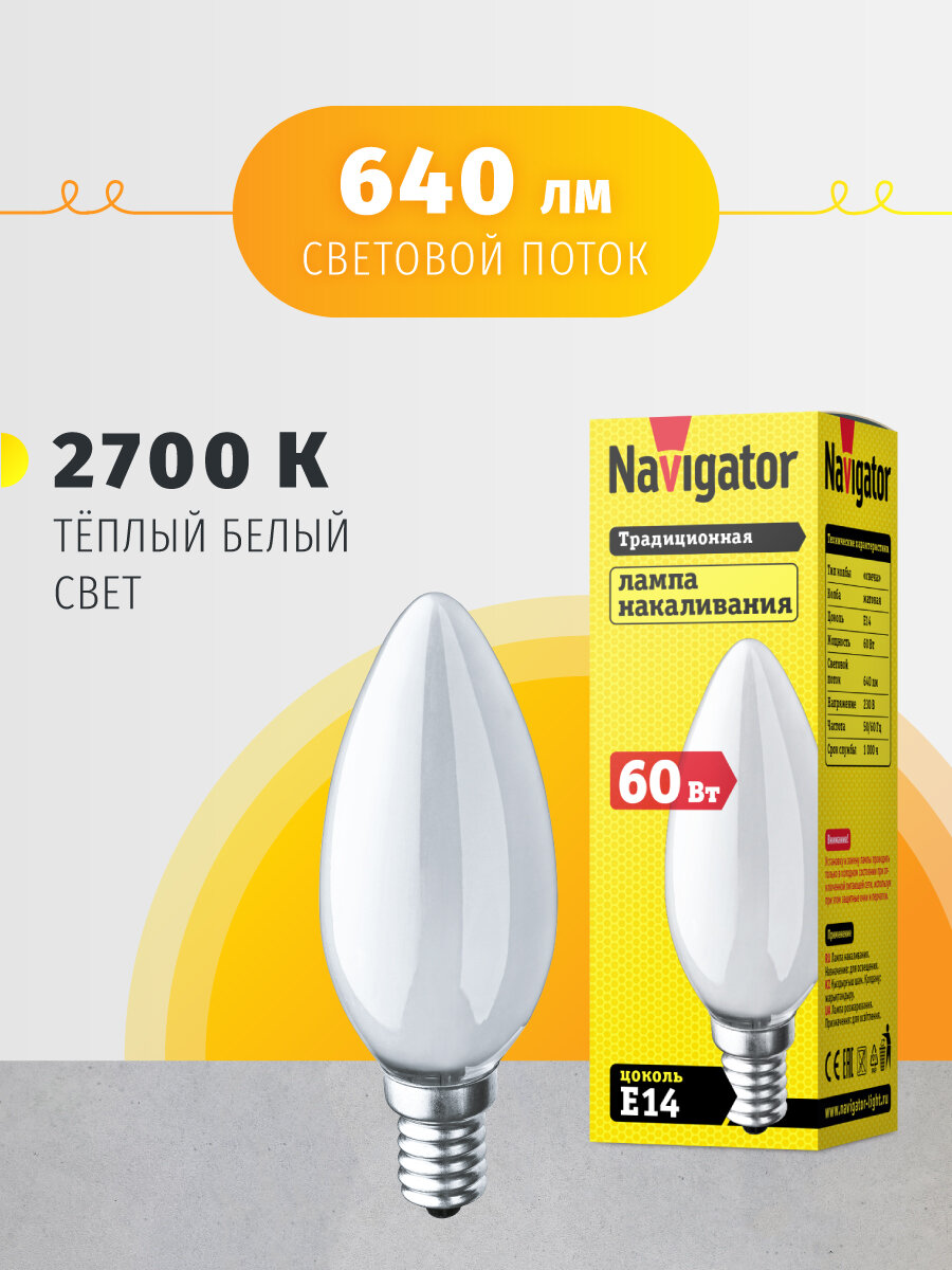 Лампа накаливания Navigator 94 309 NI-B, свеча, 60 Вт, Е14, упаковка 10 шт информация: