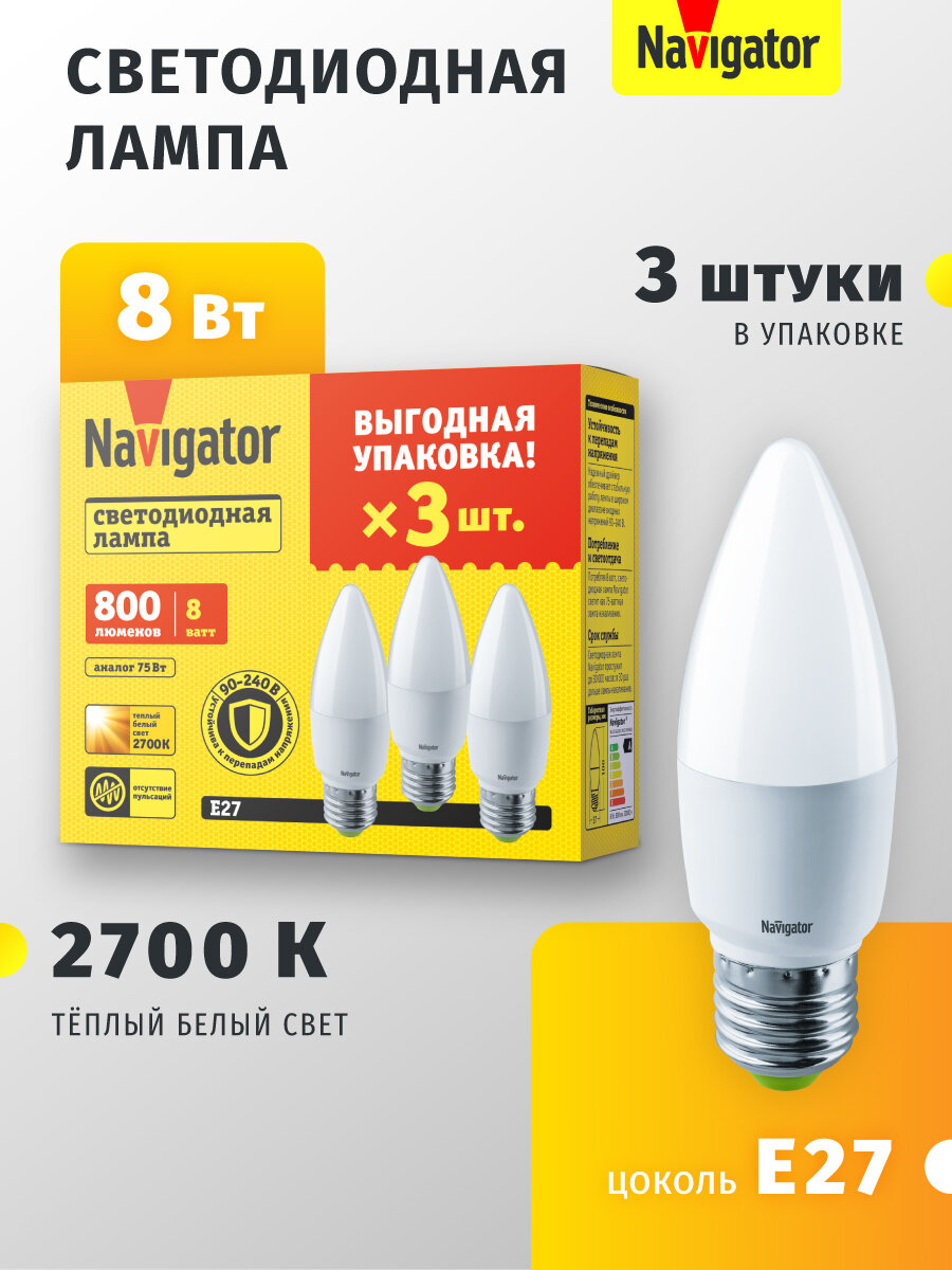10 цен на Лампа светодиодная Navigator 95 322 NLL-C37-8-230-2.7K-E27-FR-PACK3, уп. 3 шт