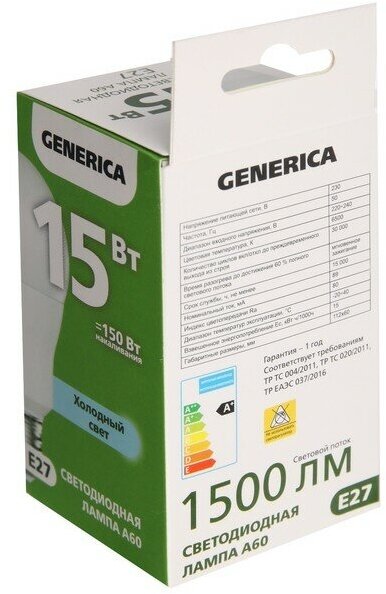Лампа светодиодная A60 15Вт грушевидная 6500К E27 230В GENERICA LL-A60-15-230-65-E27-G(3 штук.) информация: