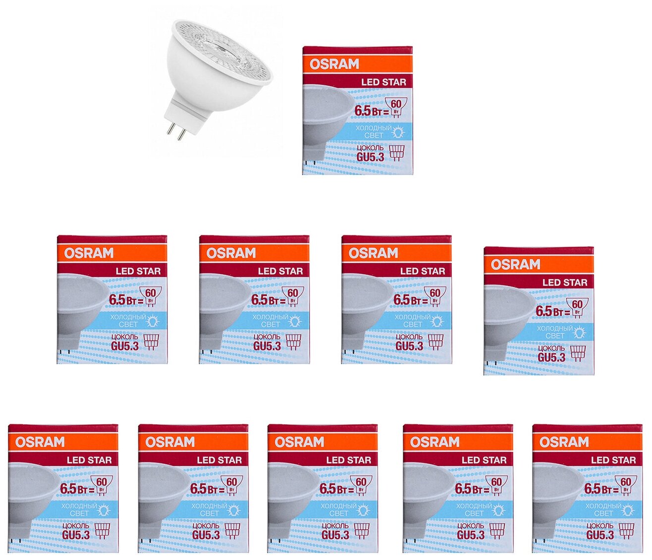 10 цен на 10шт/уп. Лампа LED Софит 6.5Вт 220-240V GU5.3 MR16 500Лм 4000К Угол 110 град. D-50mm L-50mm Свет Дневной белый OSRAM, уп. 10шт