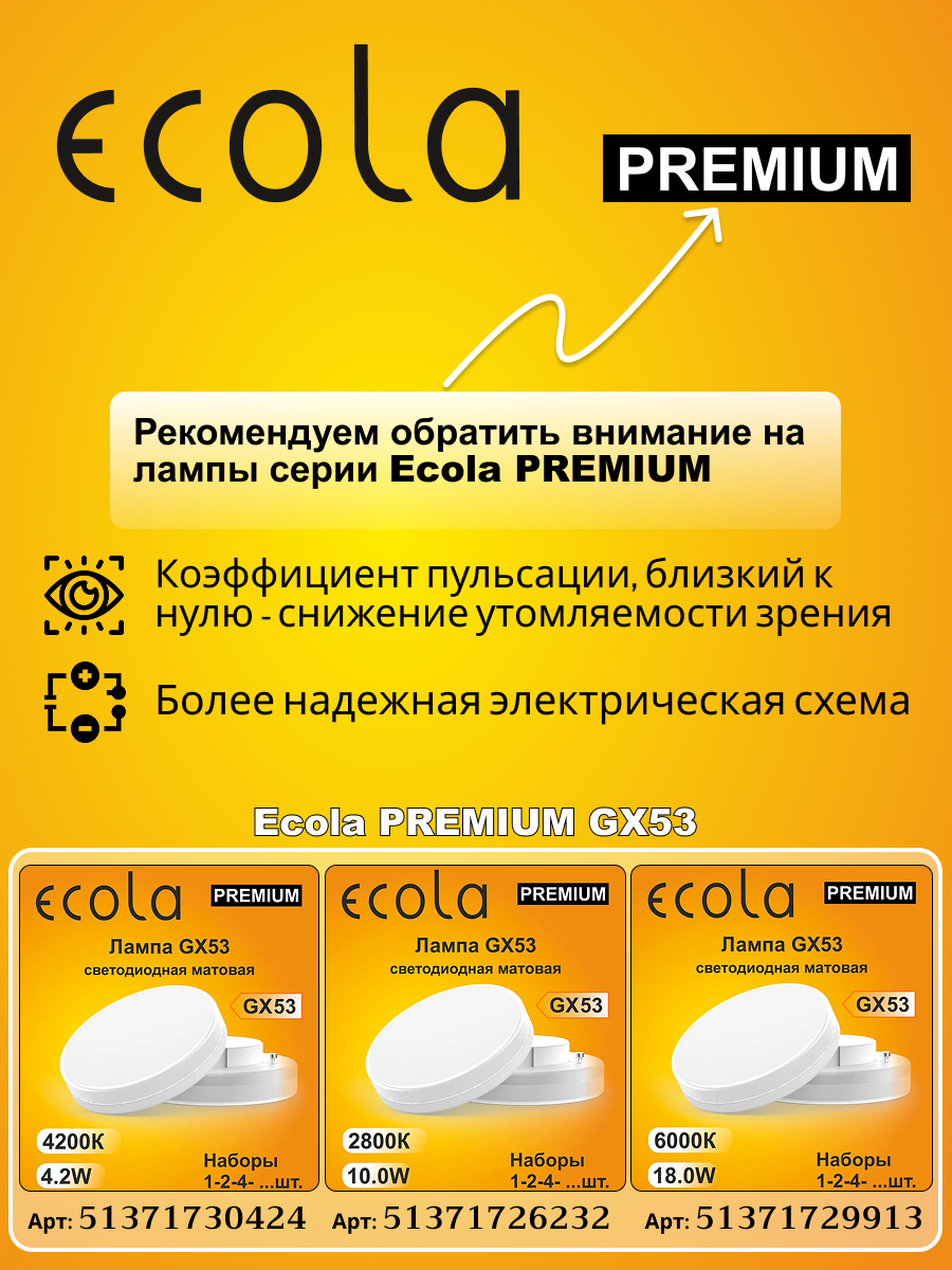 1 шт. Ecola GX53 12W 4200K (естественно-белый) матовая Экола gx53_lamp 262 ₽