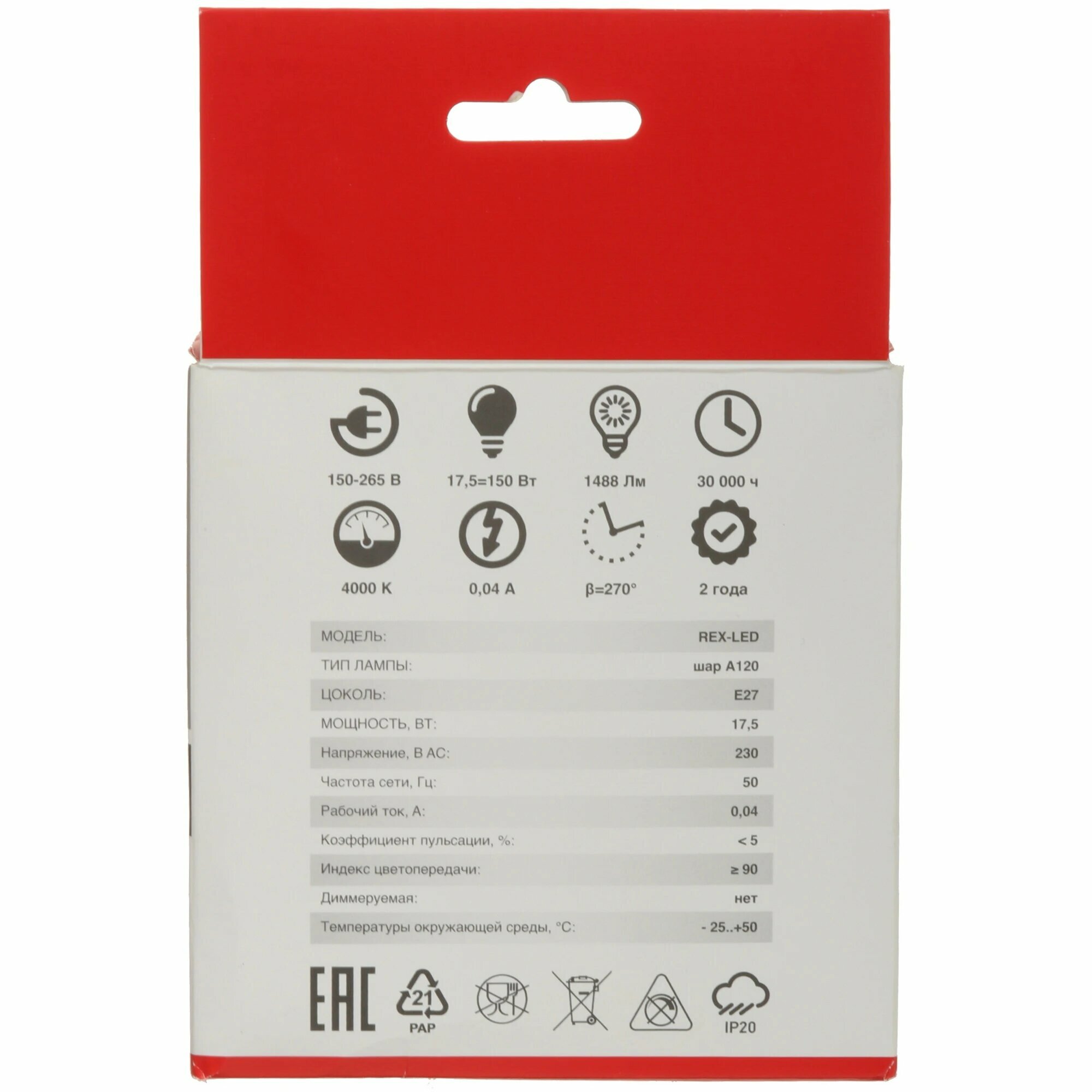 Лампа Rexant "Шар", E27, 17,5 Вт, дневной белый свет, 30 тыс. ч информация: