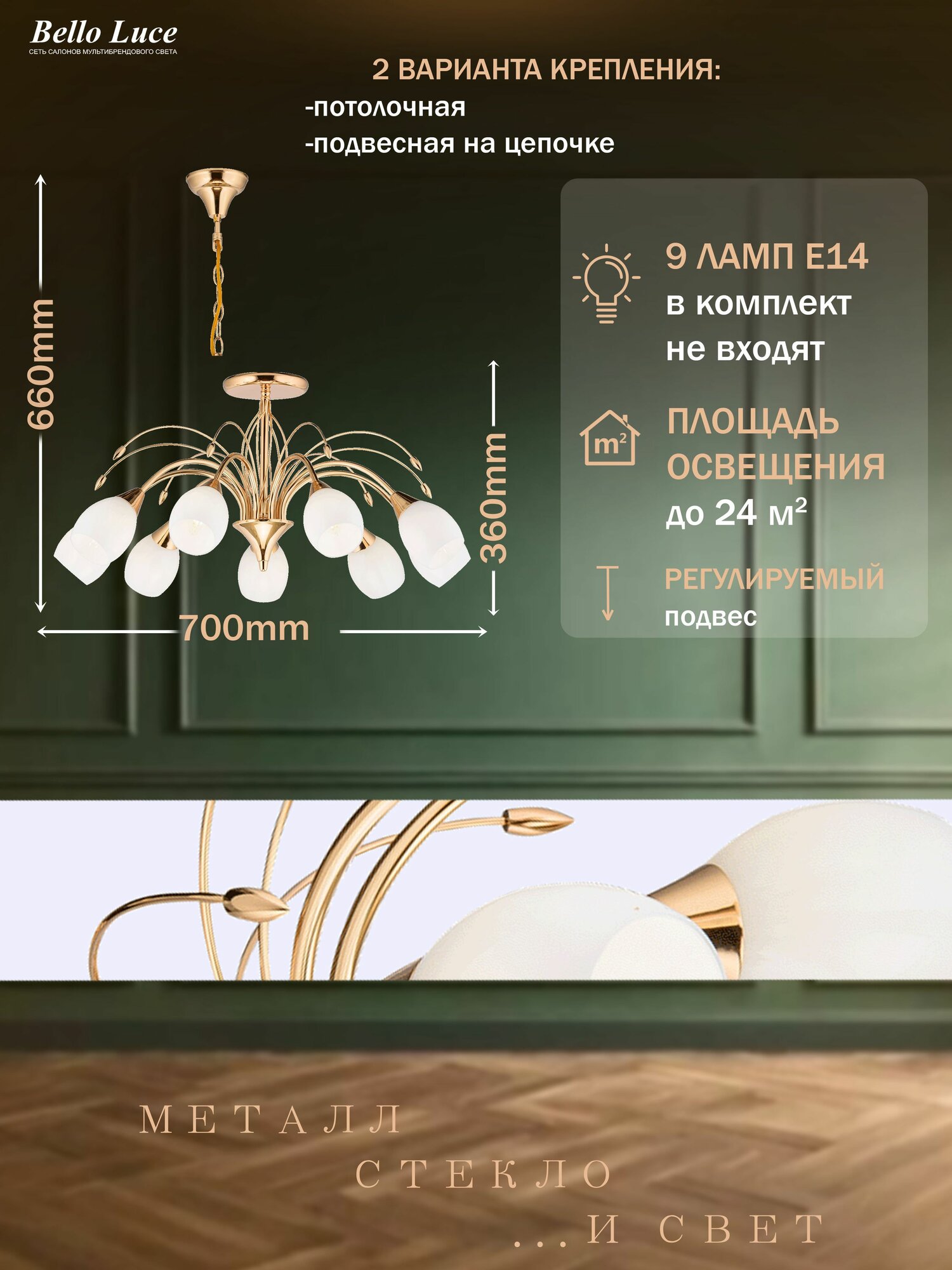 Люстра Престиж золото подвесная на 9 ламп E14, регулировка по высоте информация: