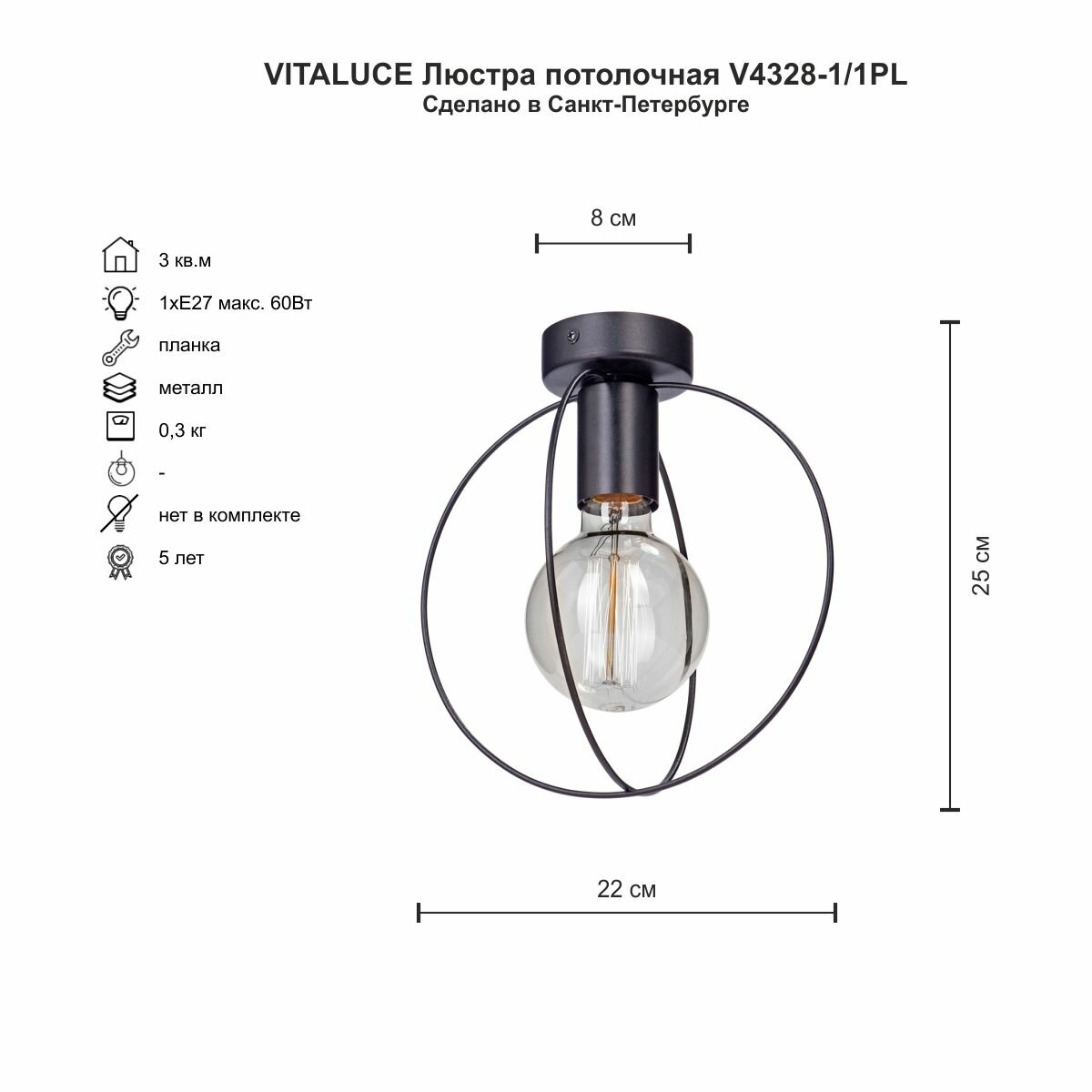 Люстра потолочная Vitaluce V4328-1/1PL , 1 лампа 3м2, Е27, макс. 60Вт, цвет чёрный матовый. информация:
