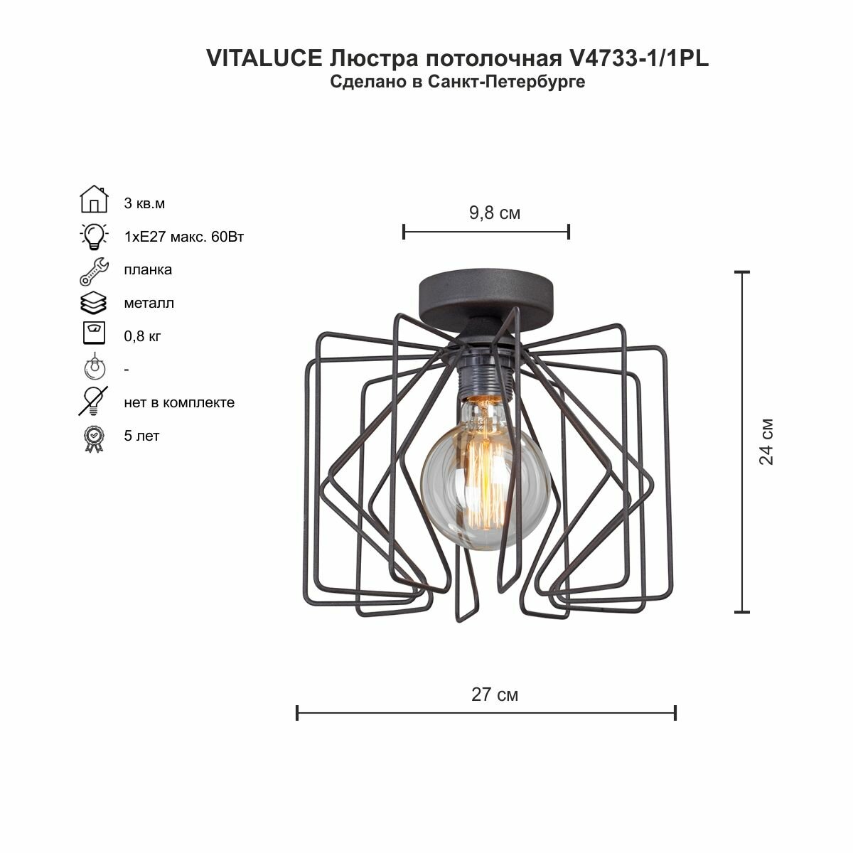 Отзывы на Люстра потолочная Vitaluce V4733-1/1PL , 1 лампа 3м2, Е27, макс. 60Вт, цвет чёрный матовый.