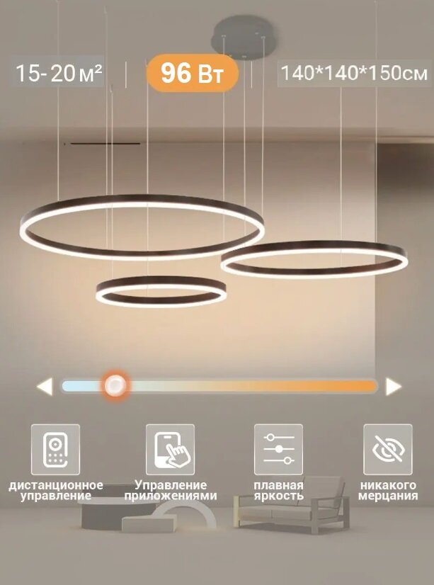 Подвесная светодиодная люстра 3 кольца 40*60*80 коричневая пульт приложение 27 000 ₽