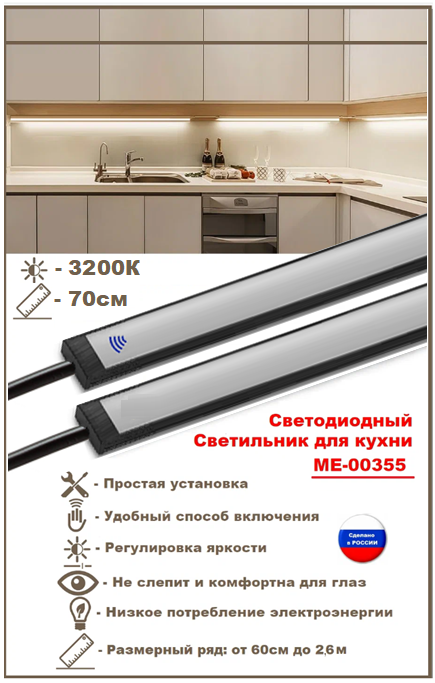 Светодиодный светильник для кухни под навесные шкафы, с включателем от взмаха руки, 70см, 3200К-тёплый. 2 090 ₽