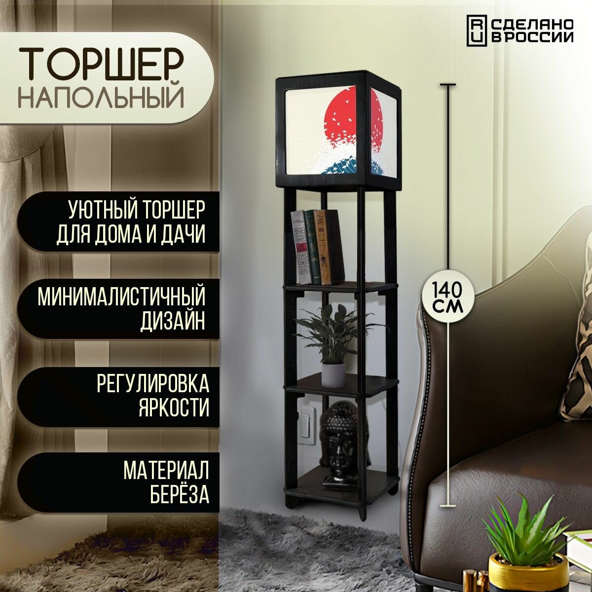 Отзывы на Напольная лампа с полками квадратная, напольный светильник с принтом азия эстетика (япония, волна, море, журавли, солнце) - 2025