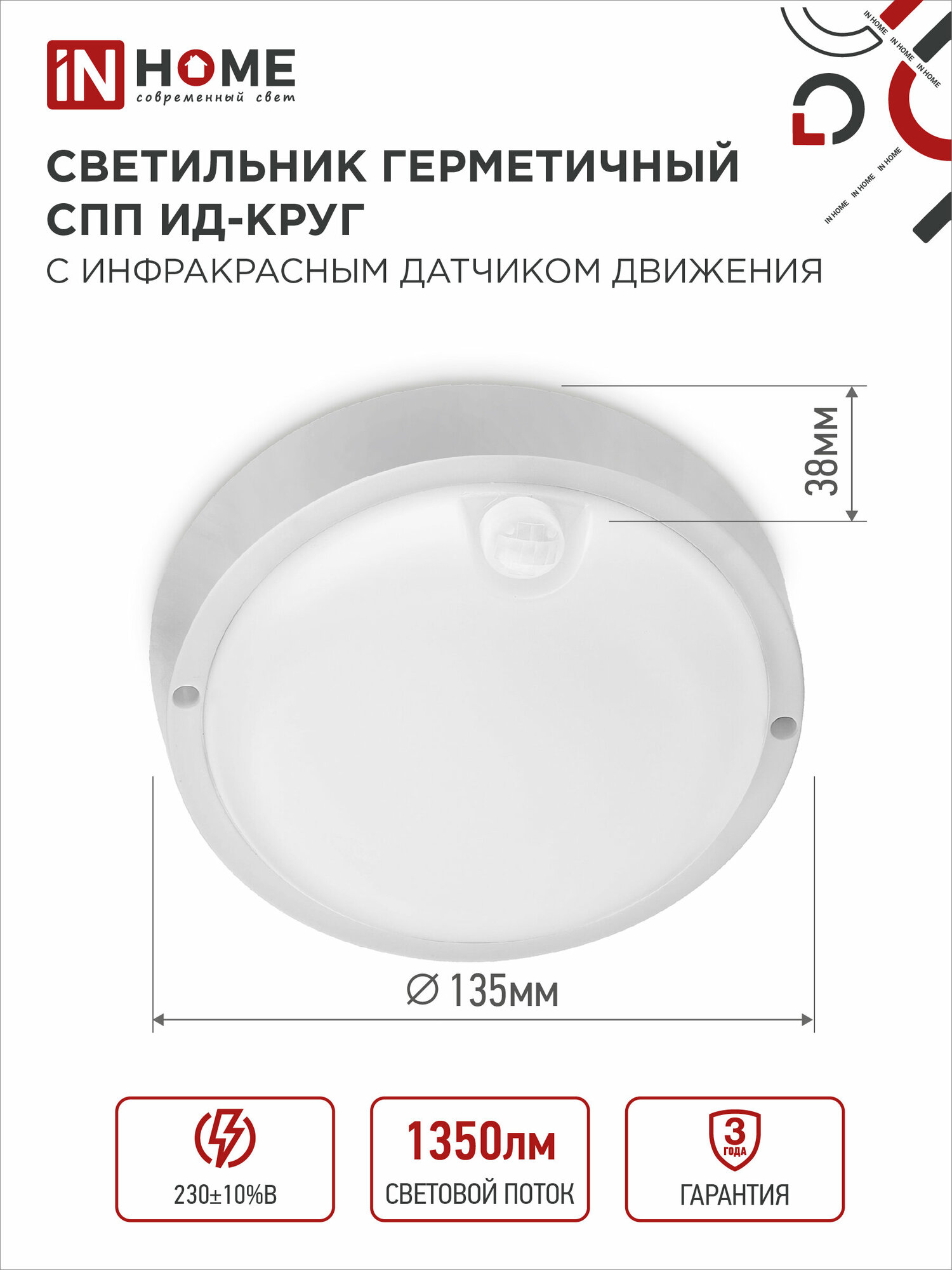 Светильник светодиодный герметичный СПП ИД-1565-КРУГ 15Вт 6500К 1350Лм с инфракрасн датчиком IP65 140мм IN HOME информация: