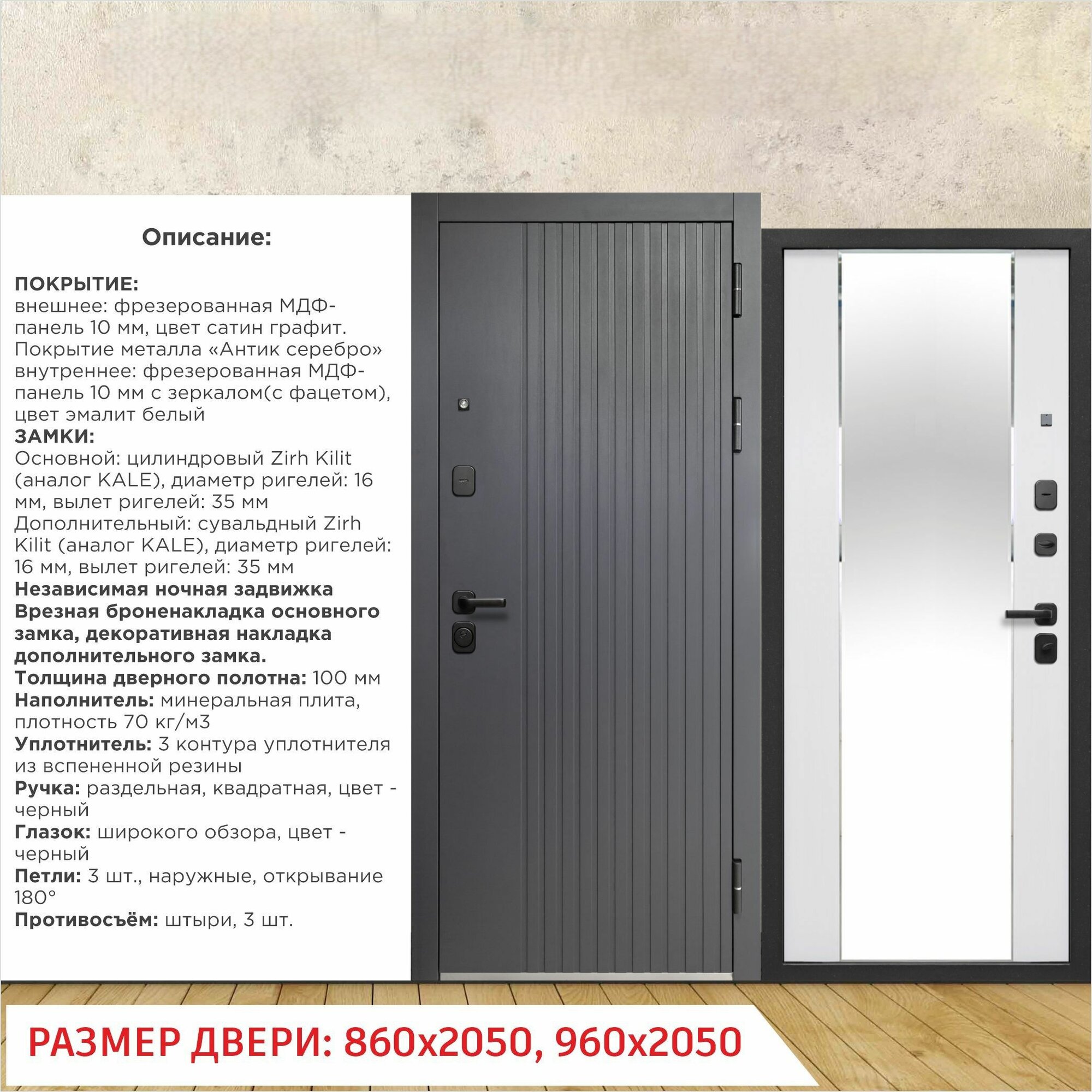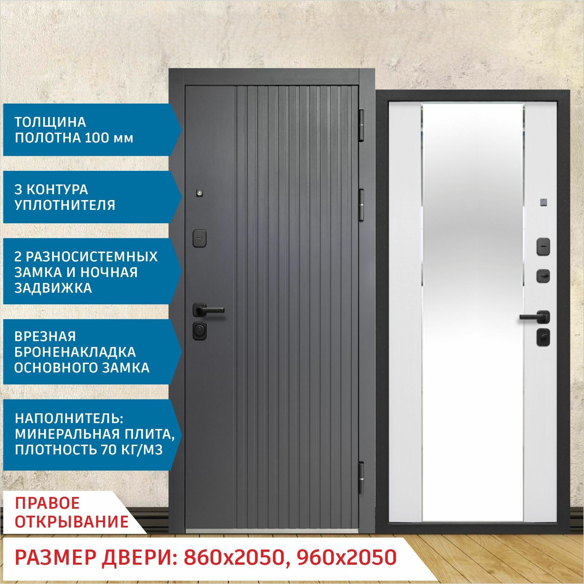 Дверь входная металлическая Тайга 9 см 2МДФ Зеркало 2050x860 Правая информация: