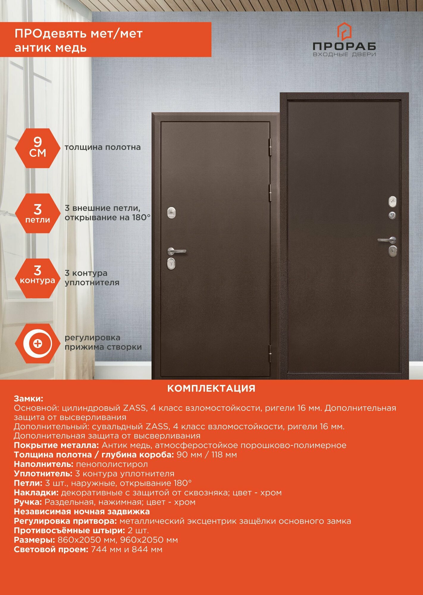 10 цен на Входная дверь с ПРОдевять Металл/Металл Антик Медь 3 петли (860мм) правая