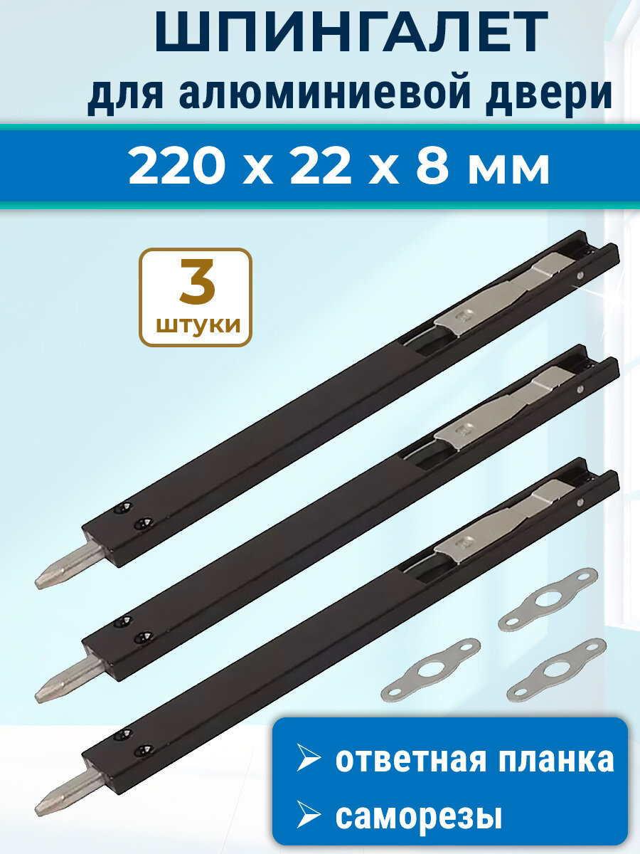 Лот 3 шт: Шпингалет для алюминиевой двери, ответная планка, саморезы, 220*22*8 мм цвет черный информация: