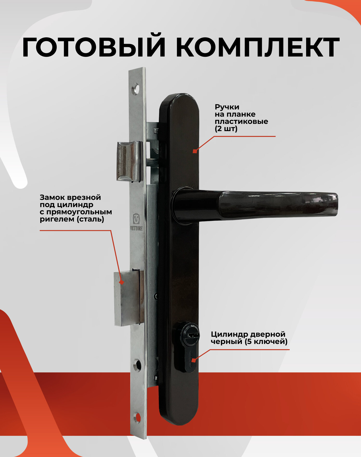 10 цен на Комплект для пластиковых дверей ручка VETTORE PVH 85-28 MBP с узкопрофильным замком 153-30 и цилиндром ZN 30*30 MBP (Черный матовый)