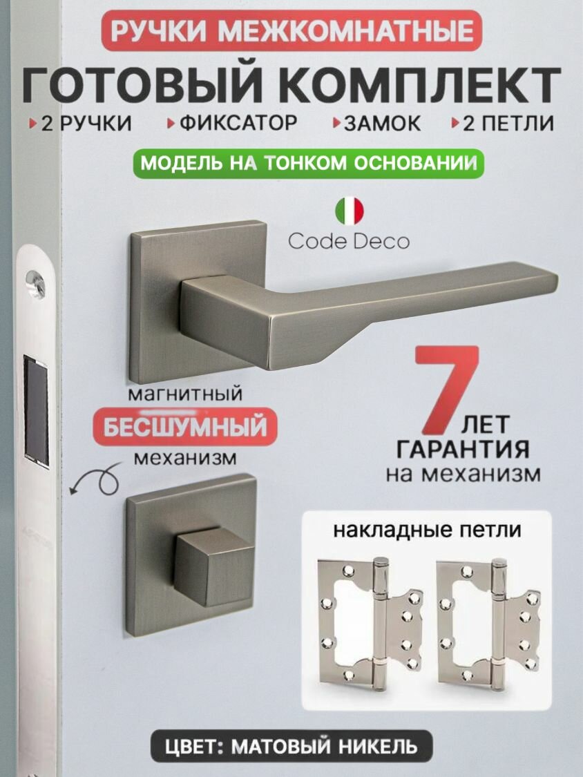 Готовый комплект 5в1 ручка дверная межкомнатная CODE DECO РР Slim H-30116-A-NISM на тонком основании / цвет Никель матовый + защелка с фиксацией + WC-фиксатор + петли накладные (2 шт) информация: