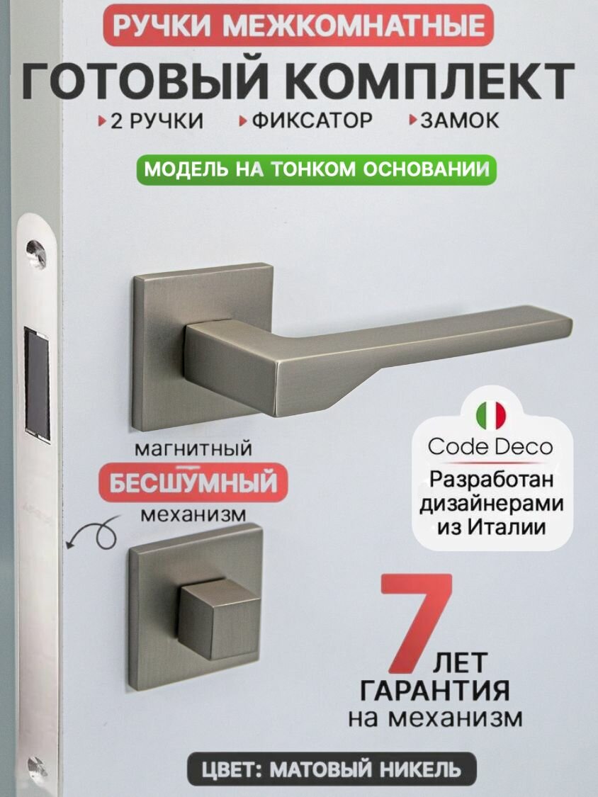 Отзывы на Готовый комплект 3в1 ручка дверная межкомнатная CODE DECO РР Slim H-30116-A-NISM на тонком основании / цвет Никель матовый + защелка с фиксацией + WC-фиксатор