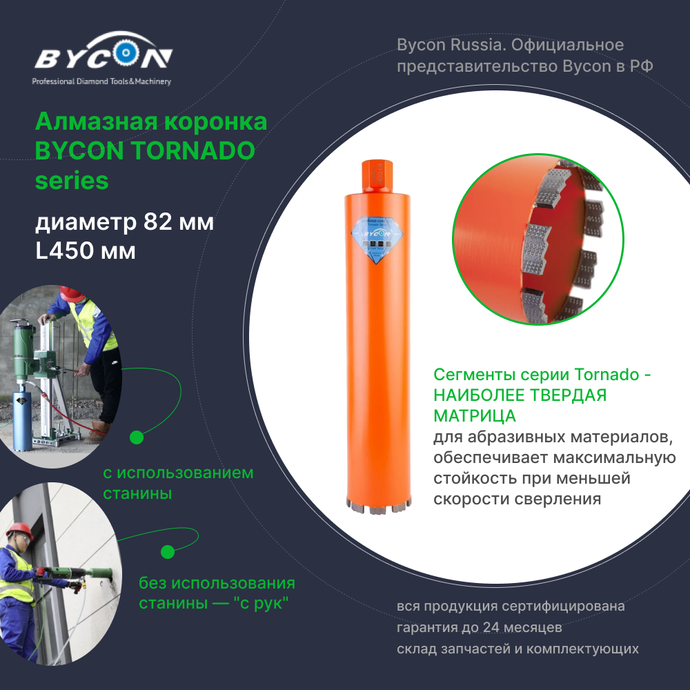 BYCON Коронка алмазная 82 х 450 мм TORNADO по бетону, кирпичу, железобетону для сухого и мокрого сверления информация: