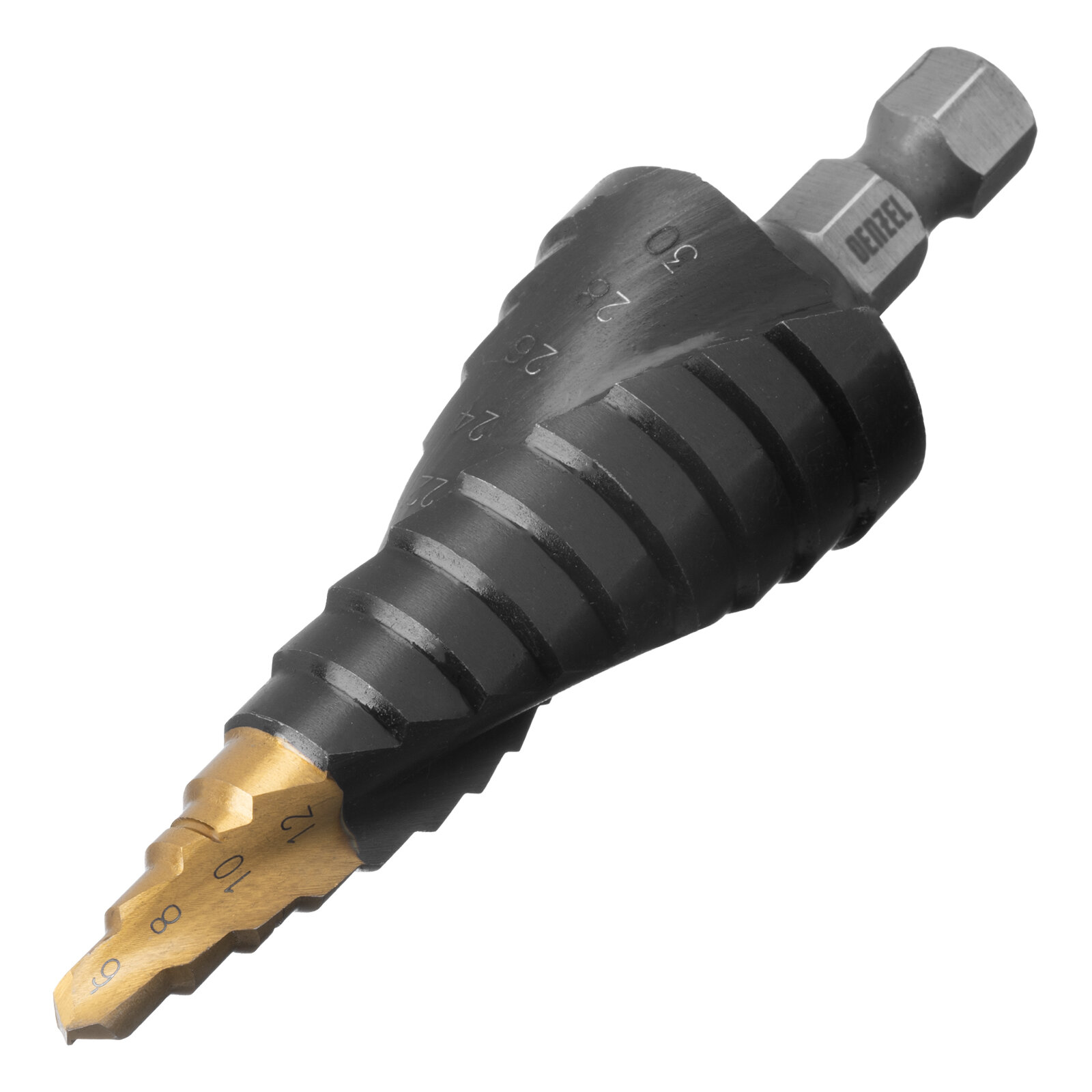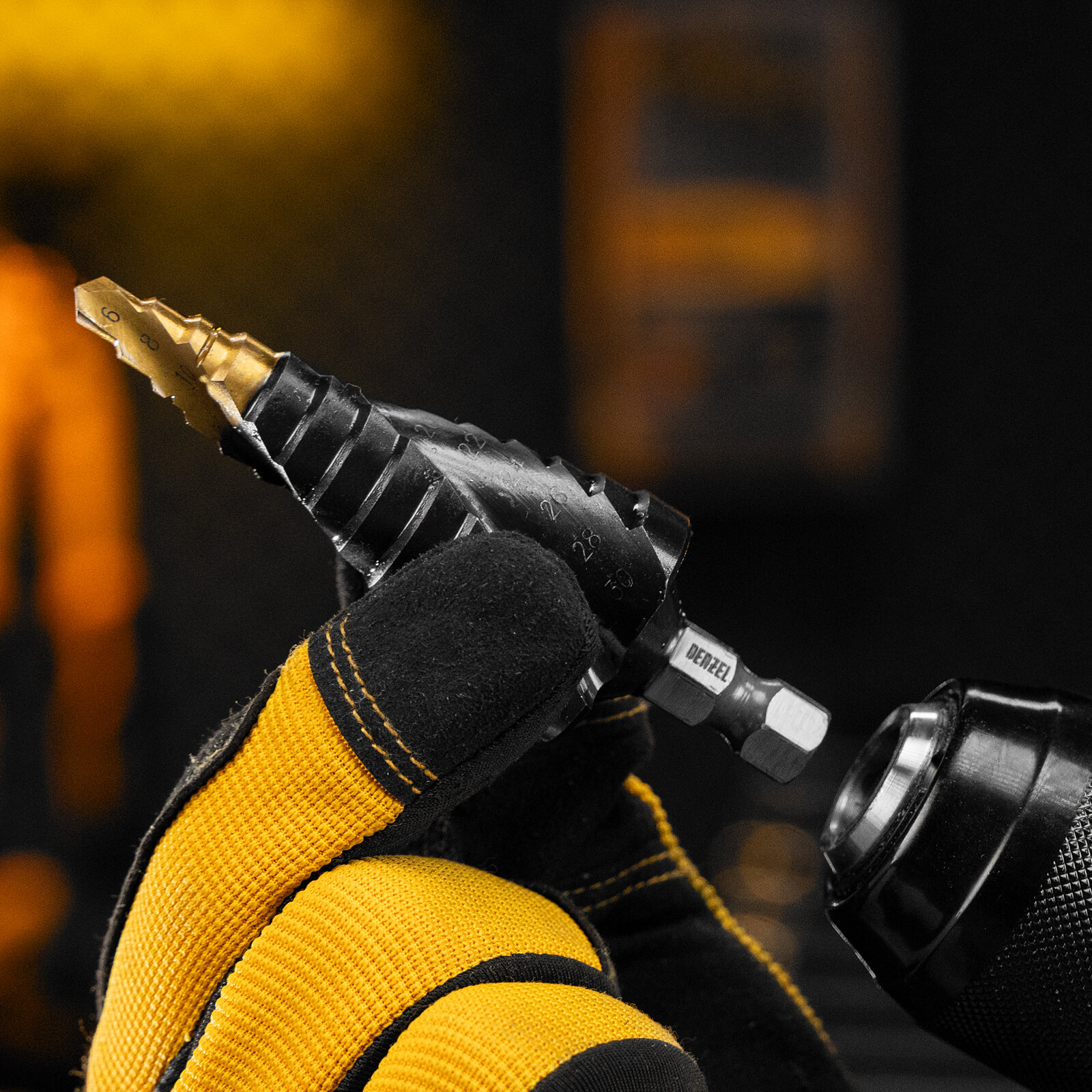 10 цен на Сверло ступенчатое Denzel 6-8-10-12-14-16-18-20-22-24-26-28-30мм, Р6М5, 6-гр. хвостовик 723604