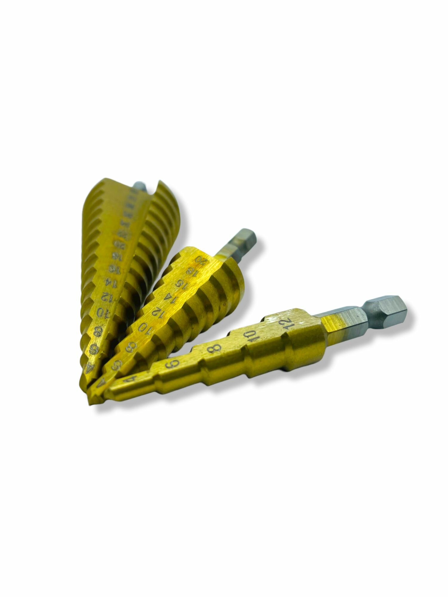 10 цен на Набор ступенчатых сверл по металлу с титановым покрытием 3шт (4-12м, 4-20м, 4-32мм)
