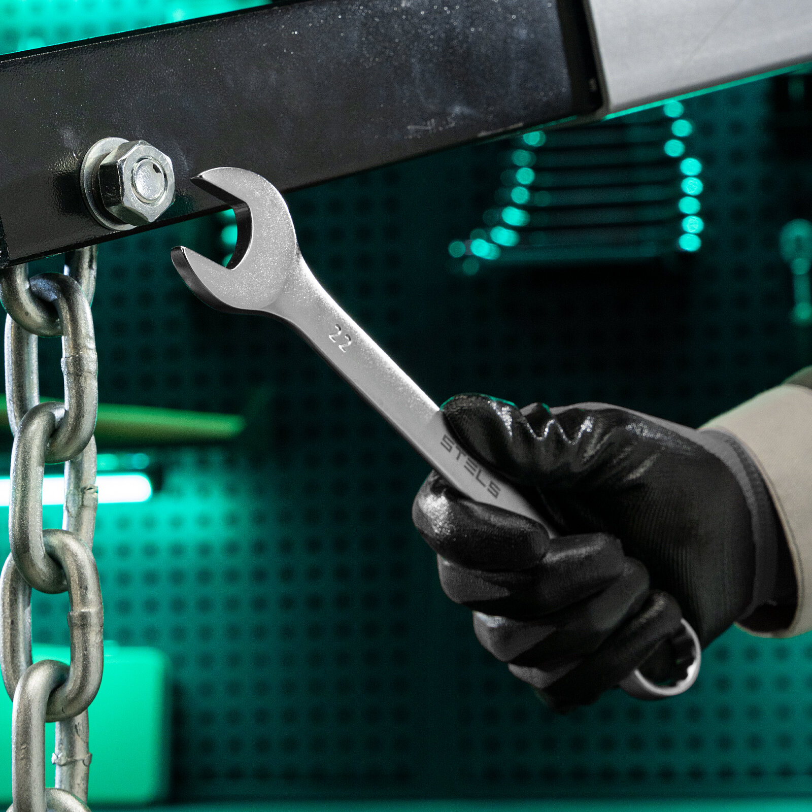 Отзывы на Ключ комбинированный Stels, 22 мм, 12 граней и изогнутая кольцевая часть, сталь CrV, матовый хром, гаечный ключ, 15216