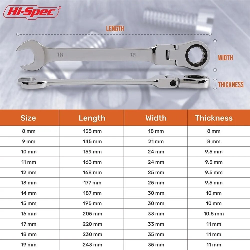 Hi-Spec Гибкий комбинированный ключ 6-19 мм, 9 мм информация: