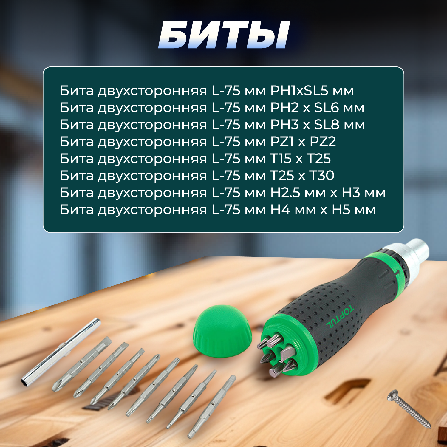 10 цен на Отвертка реверсивная с набором бит и удлинителем TOPTUL (GAAR1002)