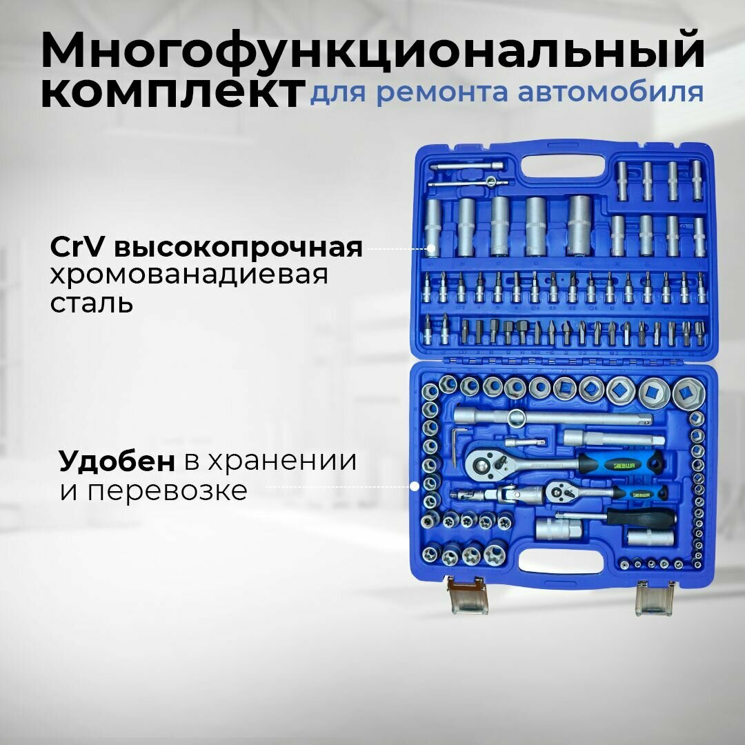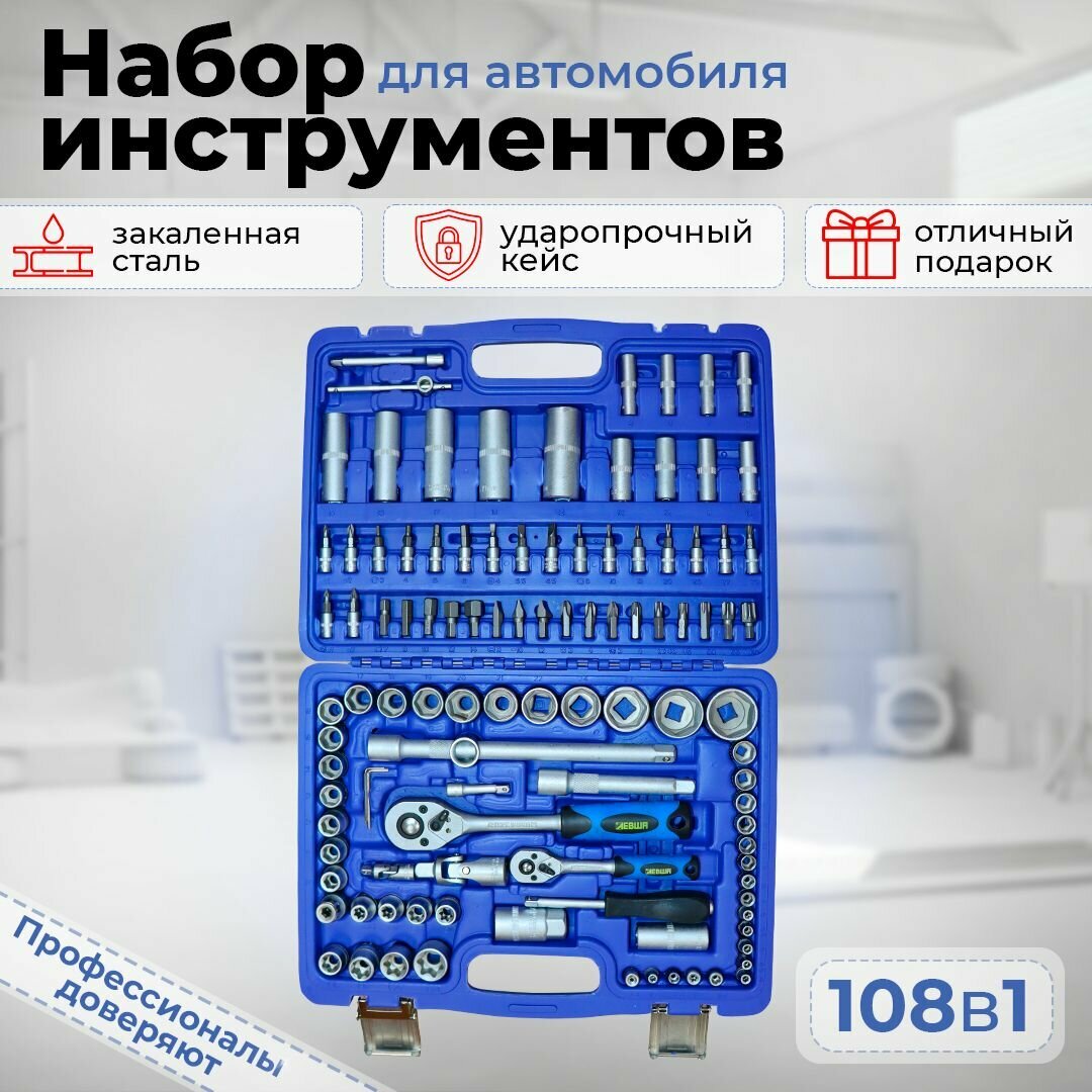 10 цен на Набор инструментов в кейсе 108 предметов 1/2" 1/4" универсальный, торцевые головки, ключи, биты с трещоткой