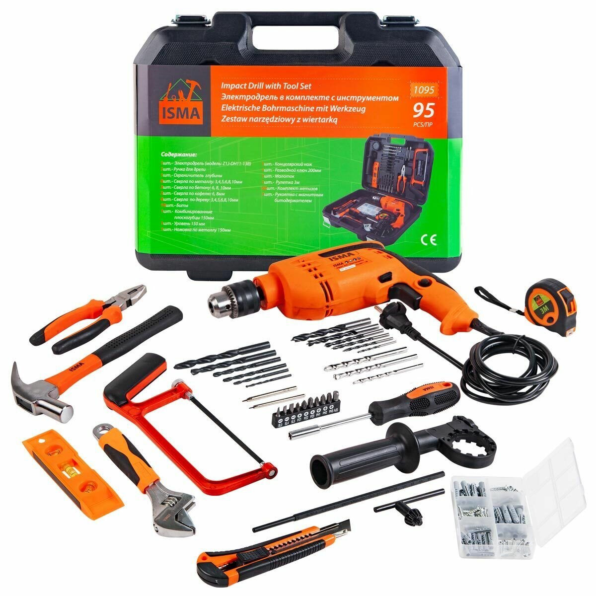 10 цен на Набор инструментов с дрелью электрической,95пр.(220V,750W,0-2900об/мин), в кейсе ISMA ISMA-1095