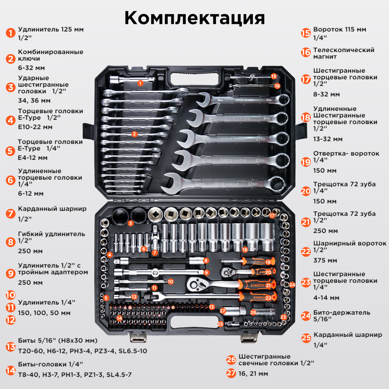 Набор инструментов KINGQUEEN, 148 шт, кейс, матовый, хромованадиевая сталь информация: