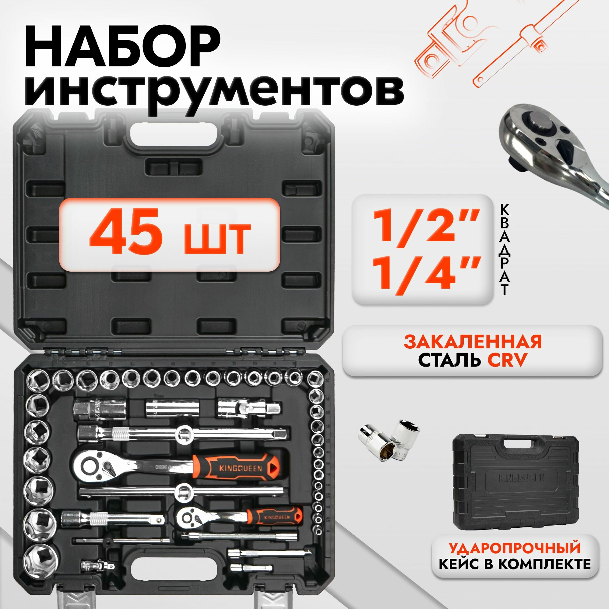 Набор инструментов KINGQUEEN, 45 предметов в кейсе, закаленная сталь CRV информация: