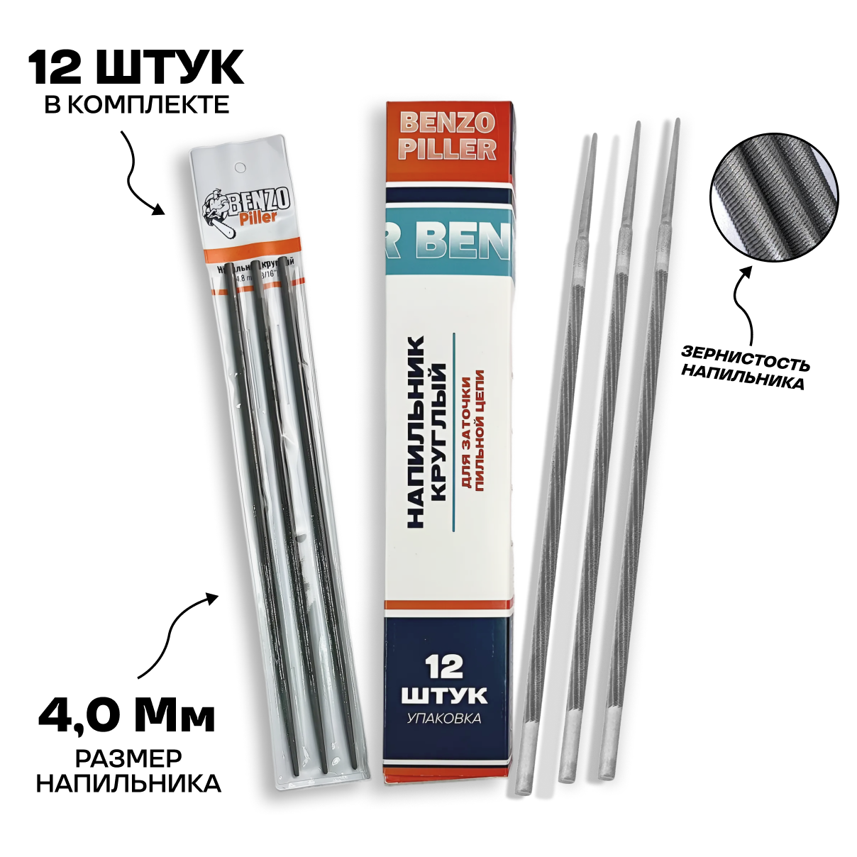 Напильники круглые 4,0 мм, 12 штук в коробке, BENZOPILLER информация: