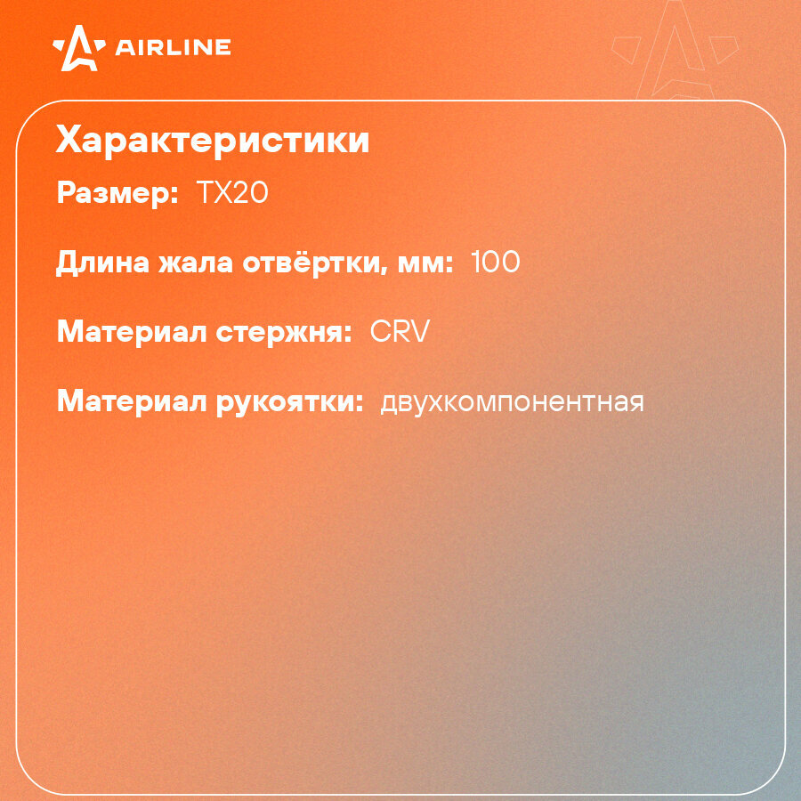 Отвертка TORX TX20x100мм, магнитный наконечник, пласт. подвес ATBX008 AIRLINE информация: