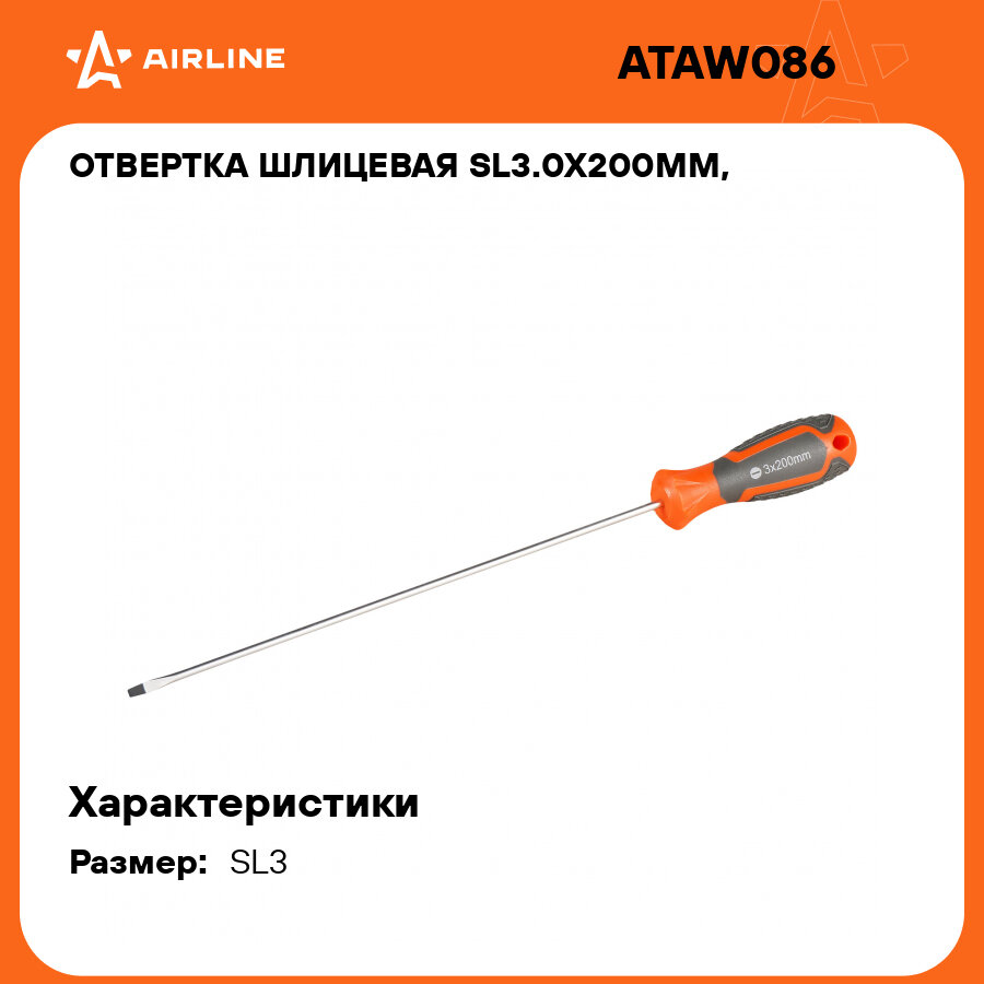 Отвертка шлицевая SL3.0x200мм, магнитный наконечник, пласт. подвес ATAW086 AIRLINE информация: