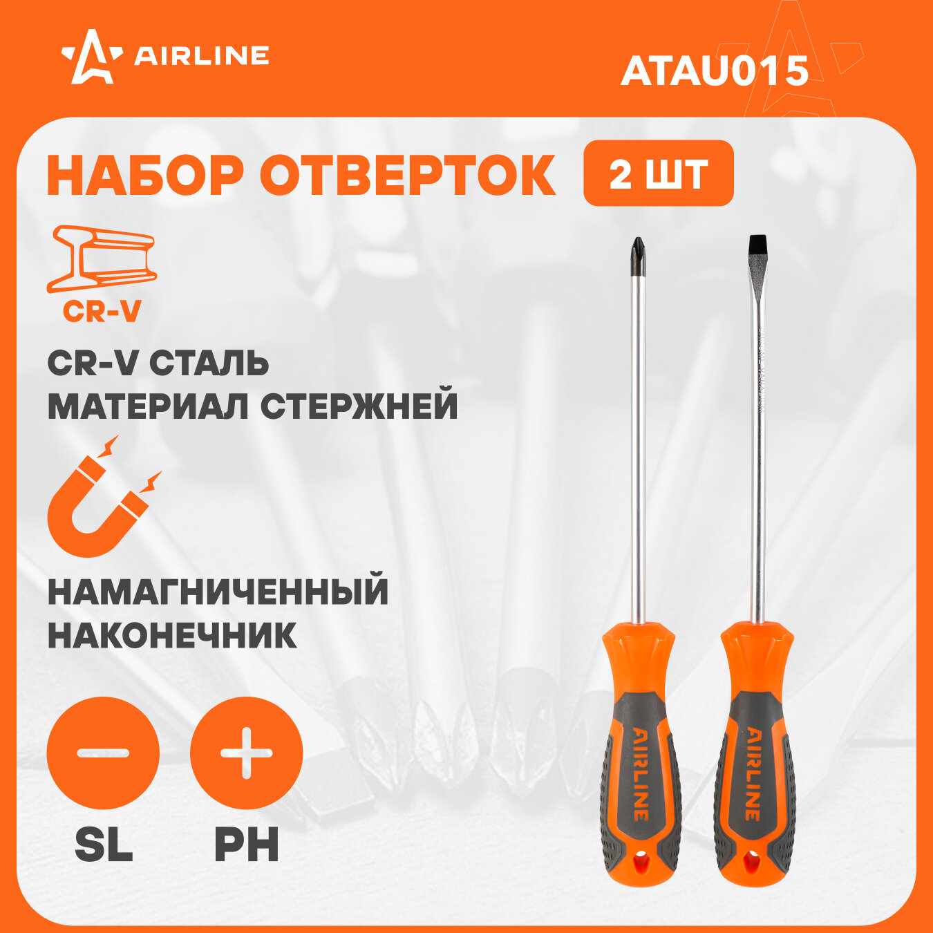 Набор отвёрток 2 пр. (SL8x200mm, PH3x200mm), пласт. подвес ATAU015 AIRLINE информация: