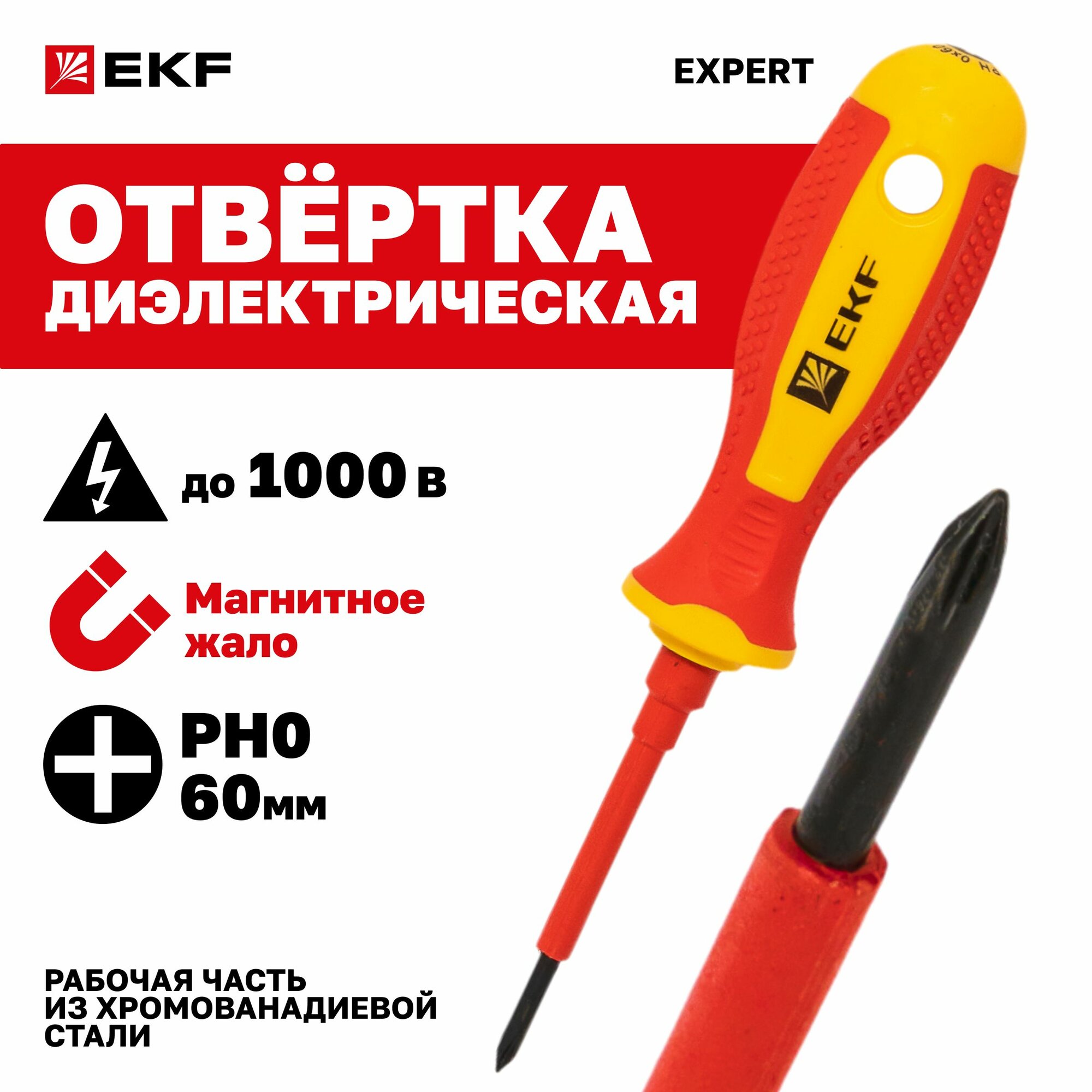 Отвертка диэлектрическая Expert PH0x60 мм 1000В EKF, двухкомпонентная рукоятка информация: