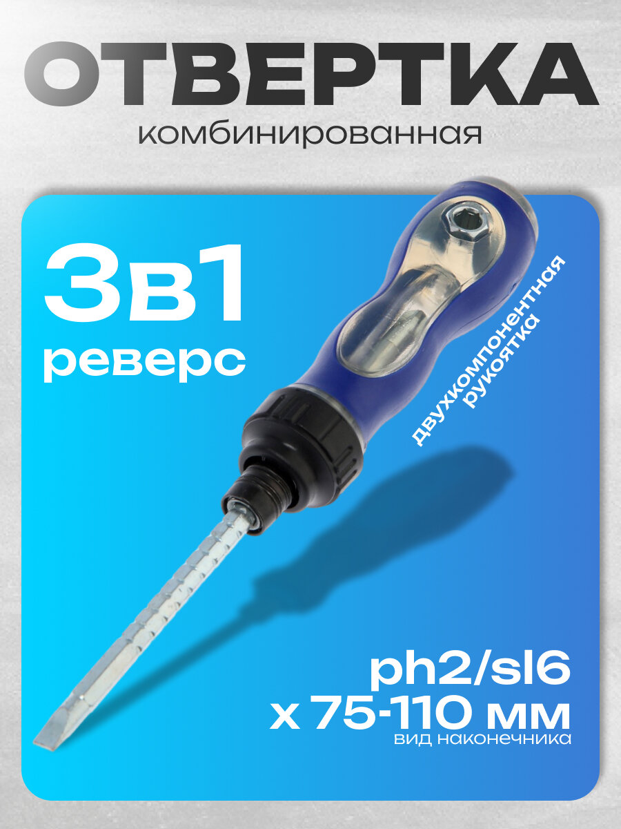 Отвертка комбинированная тундра, 3 в 1, реверс, 2К рукоятка, PH2/SL6 х 75-110 мм информация: