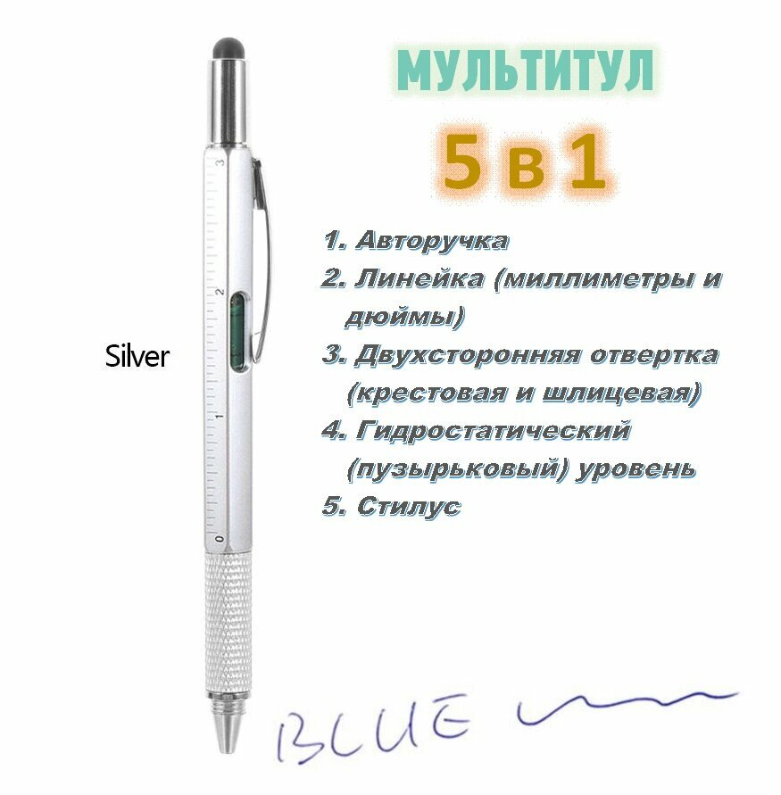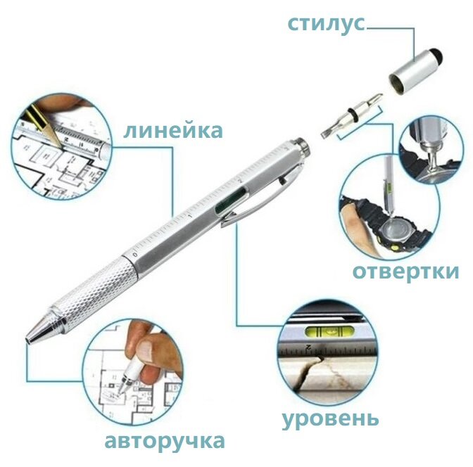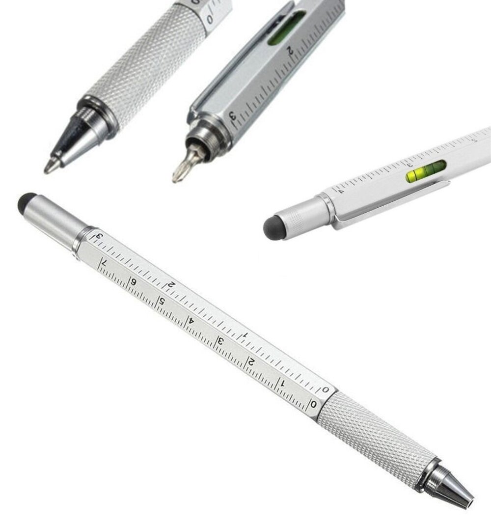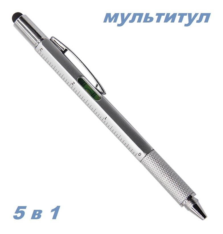 10 цен на Мультитул 5 в 1. Двухсторонняя отвертка с шариковой ручкой, уровнем, линейкой, и стилусом. Серый