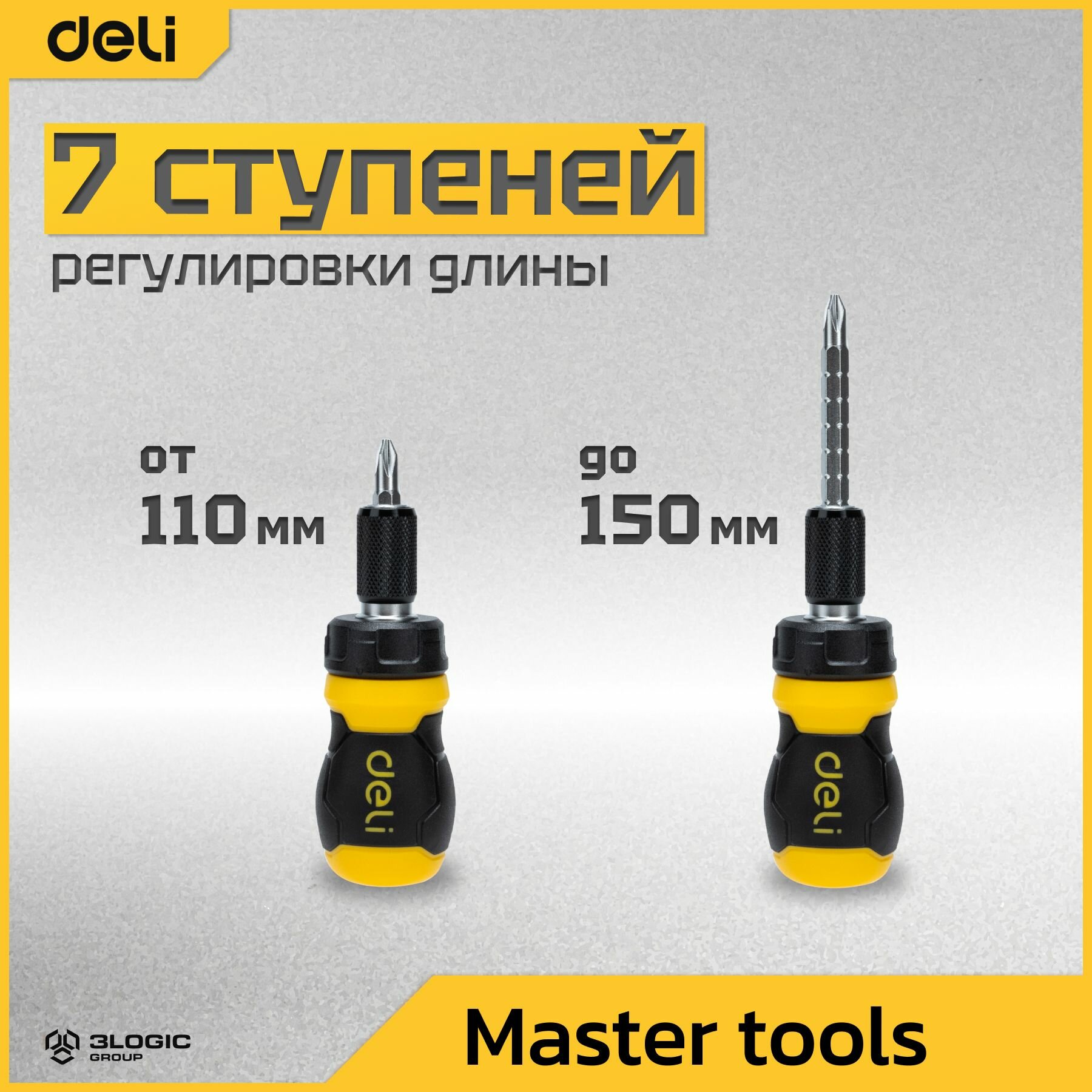 10 цен на Двухсторонняя отвертка с трещоткой PH2+SL6 Deli DL626010 (Cr-V, регулируемая длина 110-150мм, диаметр хвостовика 6мм)
