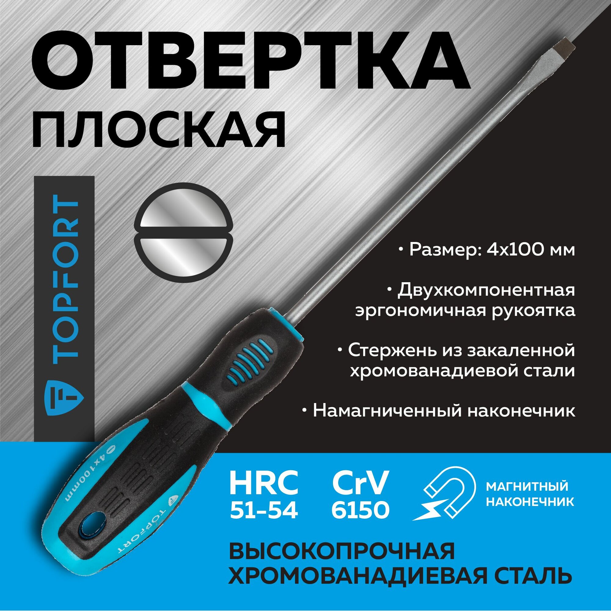 Отвертка плоская шлицевая Topfort, SL4, магнитный наконечник, хромованадиевая сталь, длина 100мм информация: