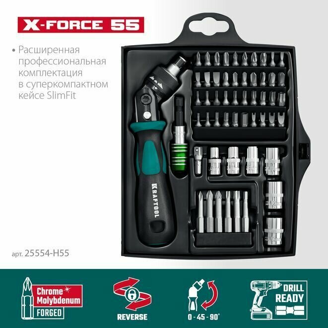 Отвертка реверсивно-рычажная в наборе с насадками X-Force-55 KRAFTOOL 55 шт. информация: