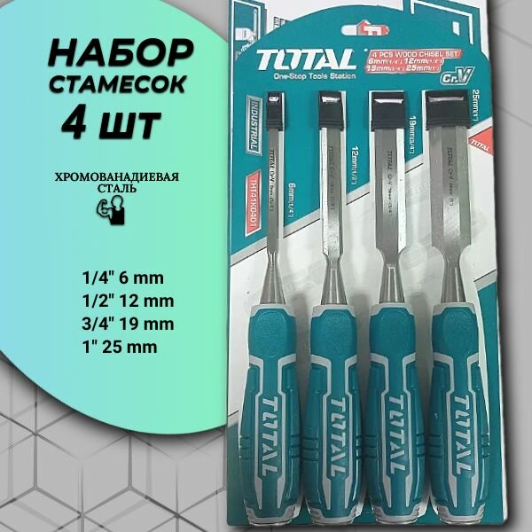 Набор стамесок TOTAL, 4 шт, легированная сталь, косой профиль информация: