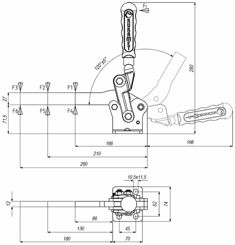 Прижим вертикальный со стопорной рукояткой KUKAMET 211-3-L, усилие 255 кг